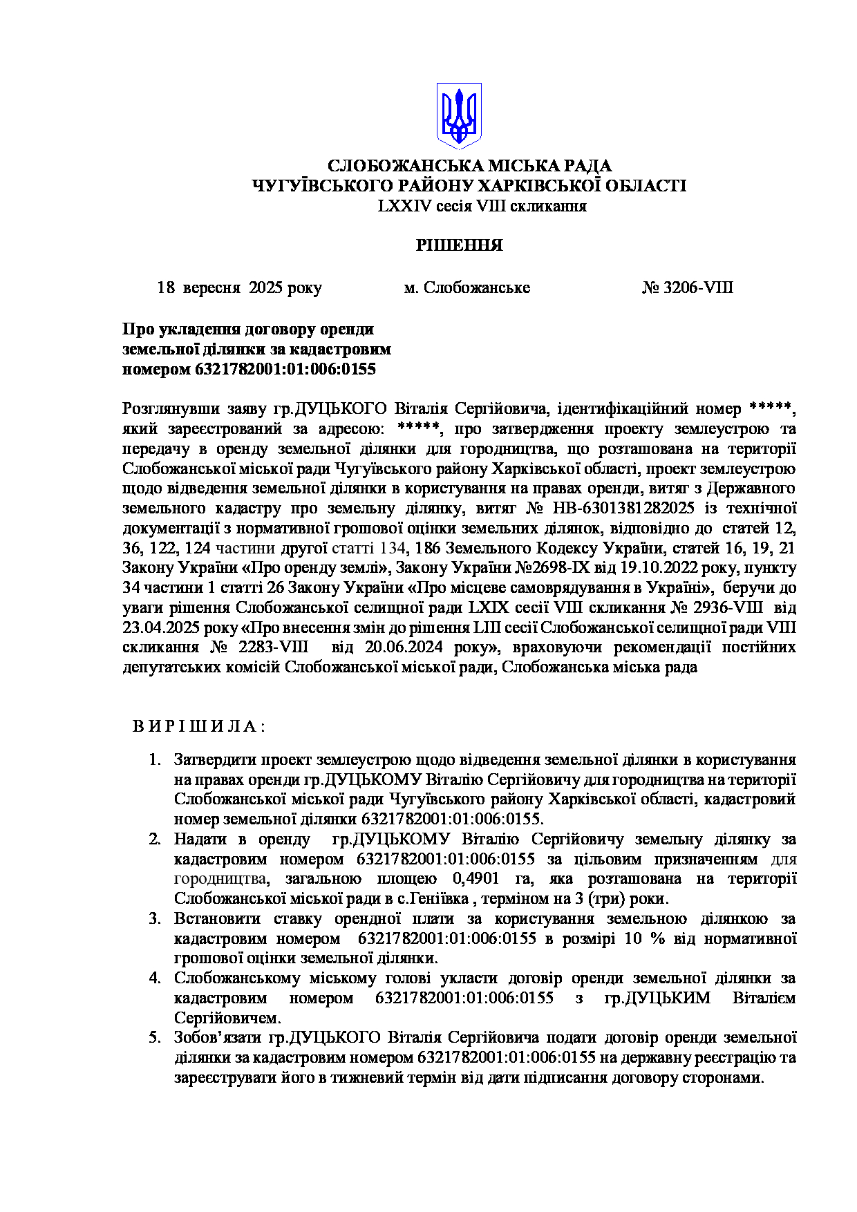 Текст рішення сесії №3206 Про укладення договору оренди земельної ділянки за кадастровим номером 6321782001:01:006:0155.