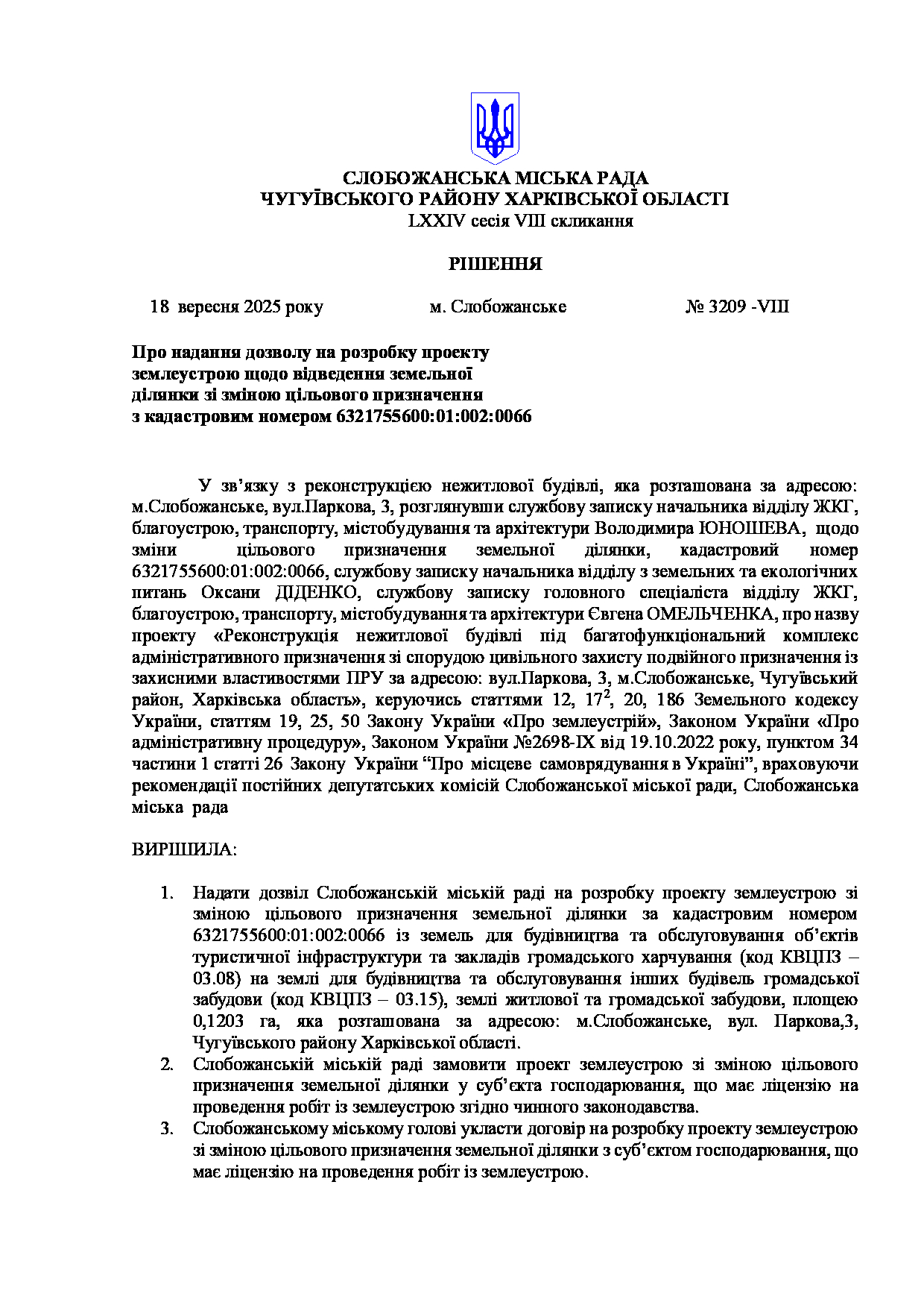 Текст рішення сесії №3209 Про надання дозволу на розробку проекту землеустрою щодо відведення земельної ділянки зі зміною цільового призначення з кадастровим номером 6321755600:01:002:0066.