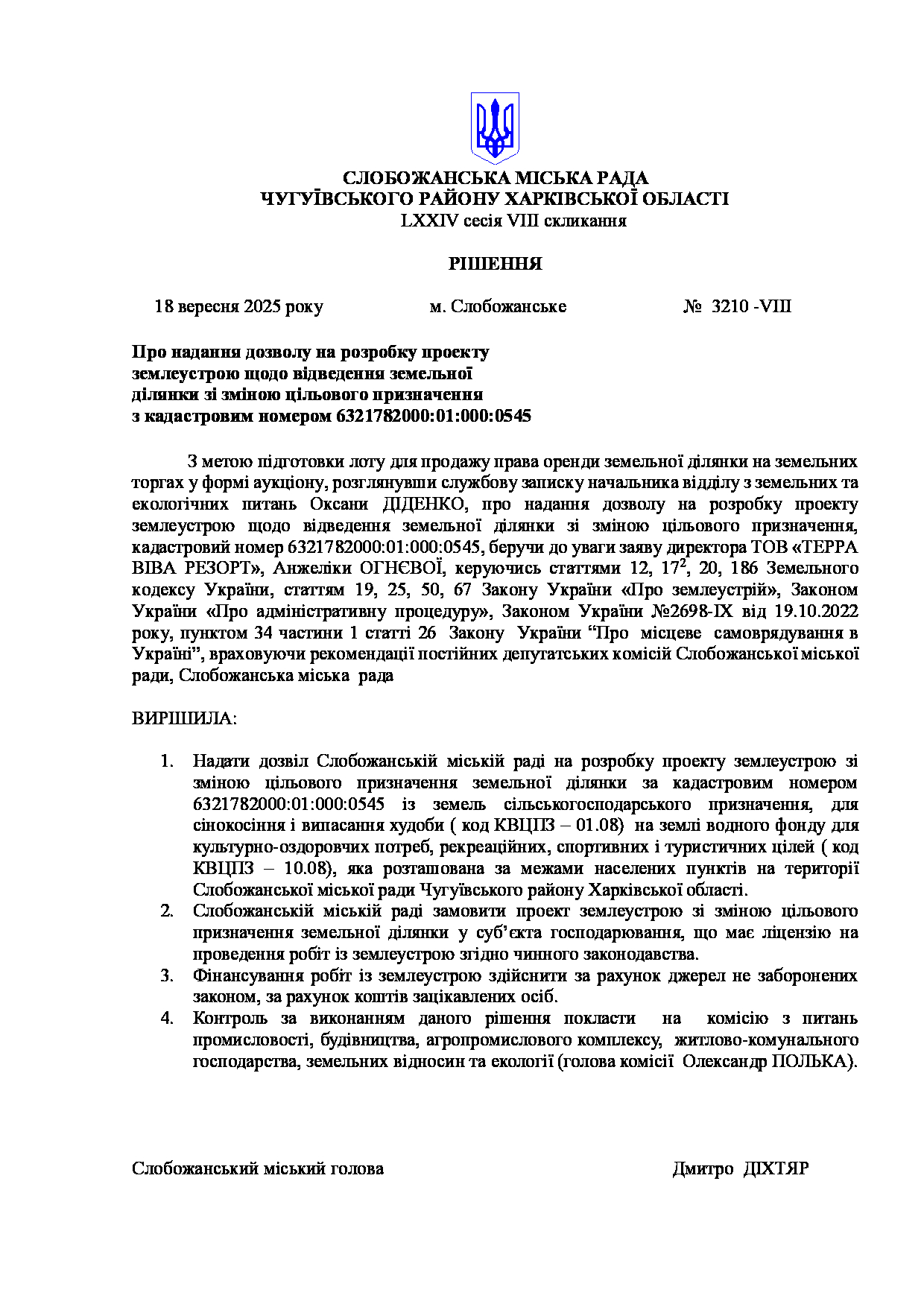 Текст рішення сесії №3210 Про надання дозволу на розробку проекту землеустрою щодо відведення земельної ділянки зі зміною цільового призначення з кадастровим номером 6321782000:01:000:0545.