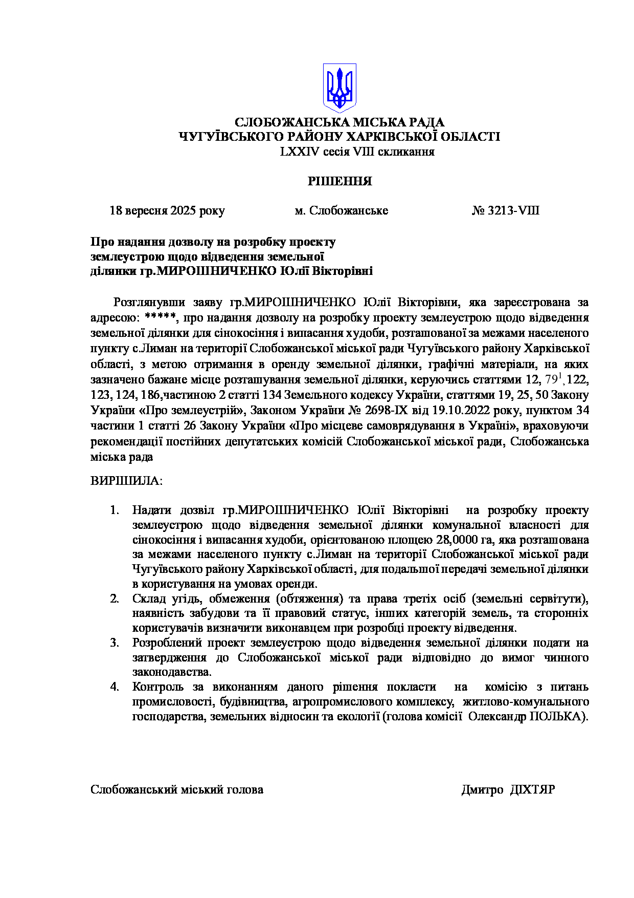Текст рішення сесії №3213 Про надання дозволу на розробку проекту землеустрою щодо відведення земельної ділянки гр.МИРОШНИЧЕНКО Юлії Вікторівні.