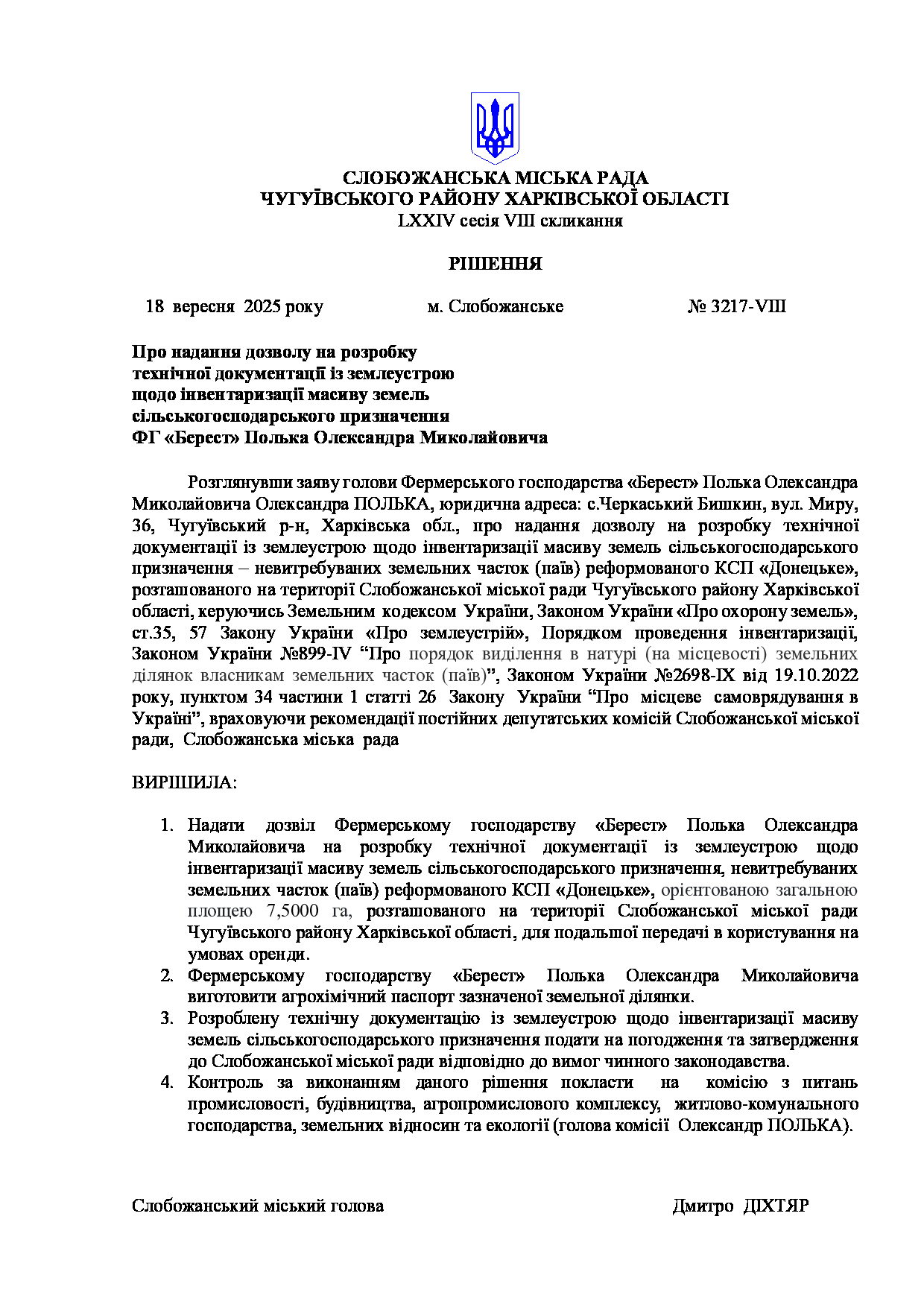 Текст рішення сесії №3217 Про надання дозволу на розробку технічної документації із землеустрою щодо інвентаризації масиву земель сільськогосподарського призначення ФГ «Берест» Полька Олександра Миколайовича.