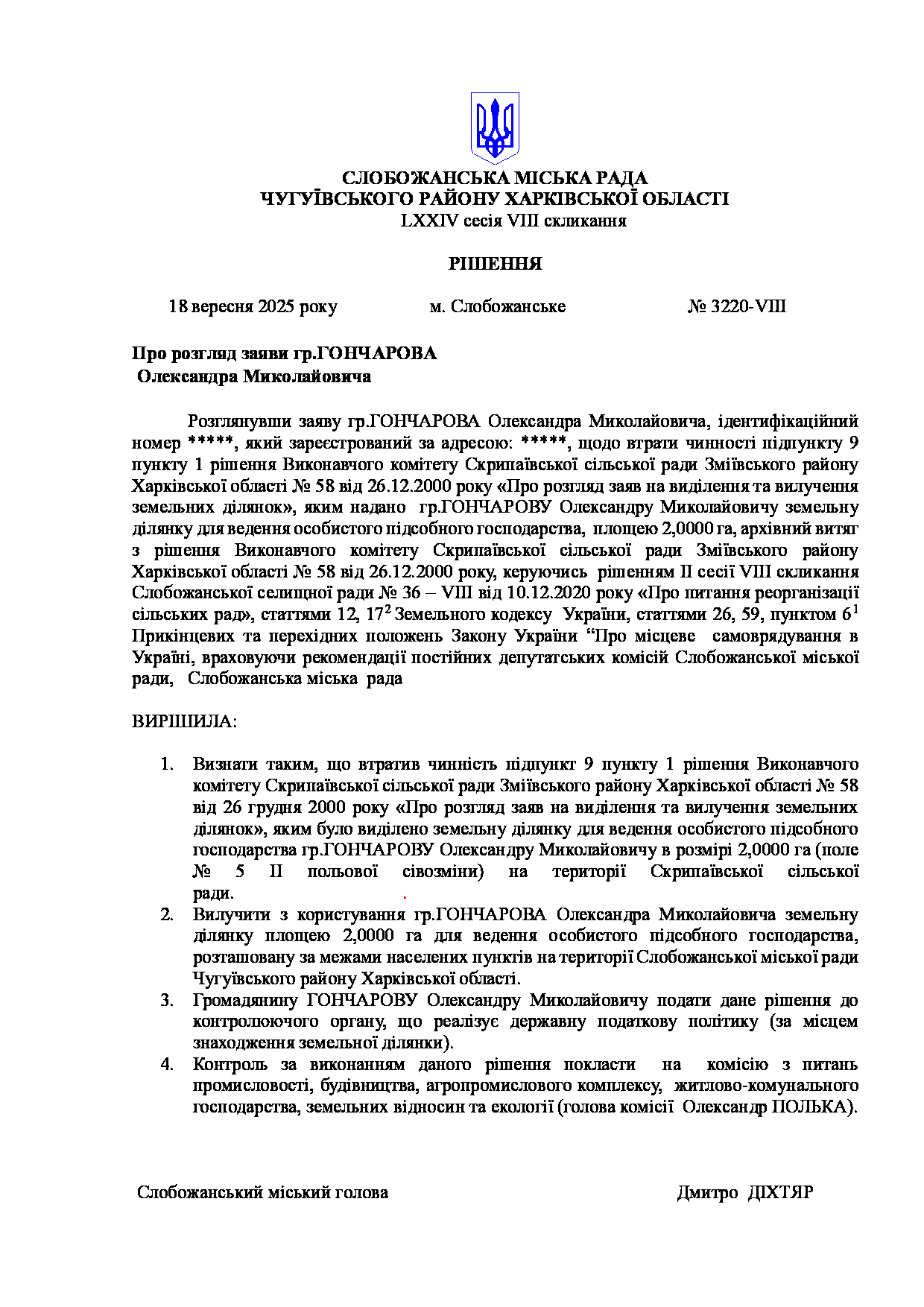 Текст рішення сесії №3220 Про розгляд заяви гр.ГОНЧАРОВА Олександра Миколайовича.