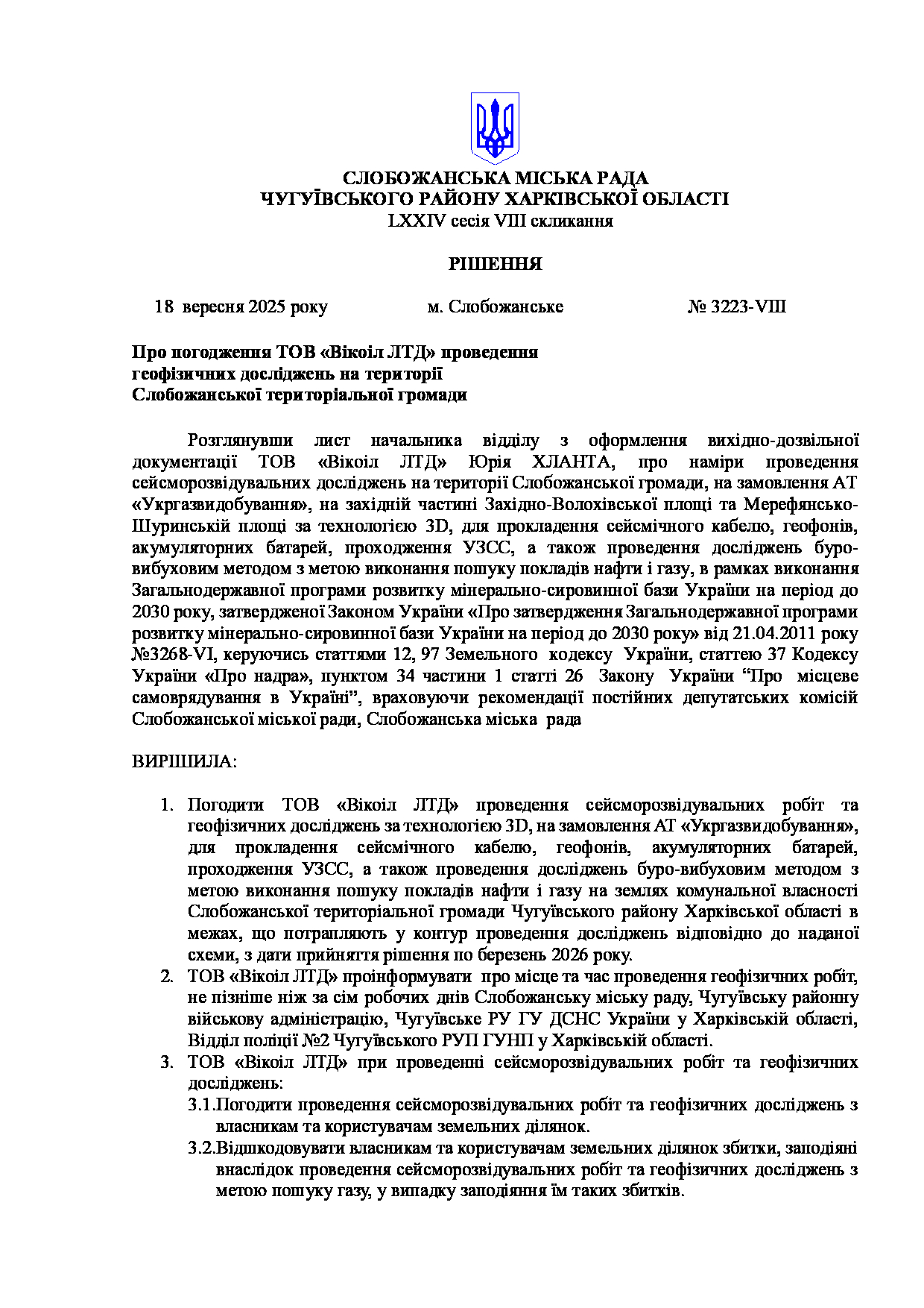 Текст рішення сесії №3223 Про погодження ТОВ «Вікоіл ЛТД» проведення геофізичних досліджень на території Слобожанської територіальної громади.