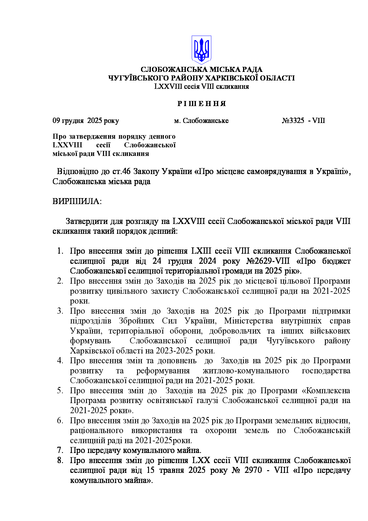 Текст рішення сесії №3325 Про затвердження порядку денного LXXVIІІ сесії Слобожанської міської ради VІІІ скликання