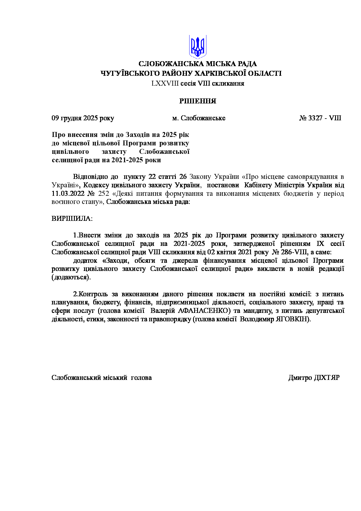 Текст рішення сесії №3327 Про внесення змін до Заходів на 2025 рік до місцевої цільової Програми розвитку цивільного захисту Слобожанської селищної ради на 2021-2025 роки