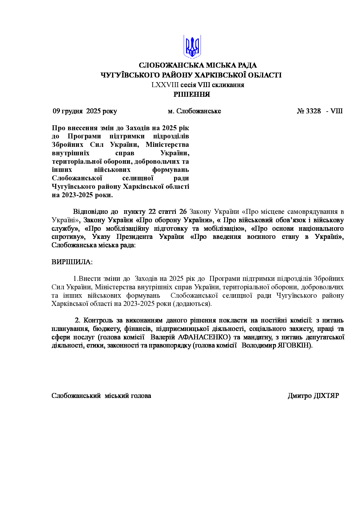 Текст рішення сесії №3328 Про внесення змін до Заходів на 2025 рік до Програми підтримки підрозділів Збройних Сил України, Міністерства внутрішніх справ України, територіальної оборони, добровольчих та інших військових формувань Слобожанської селищної ради Чугуївського району Харківської області на 2023-2025 роки