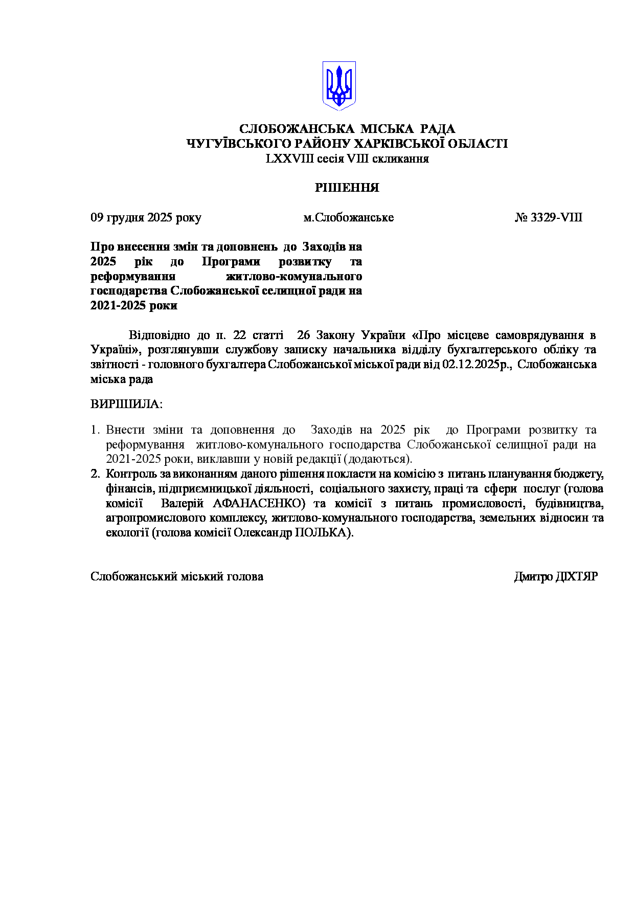 Текст рішення сесії №3329 Про внесення змін та доповнень до Заходів на 2025 рік до Програми розвитку та реформування житлово-комунального господарства Слобожанської селищної ради на 2021-2025 роки