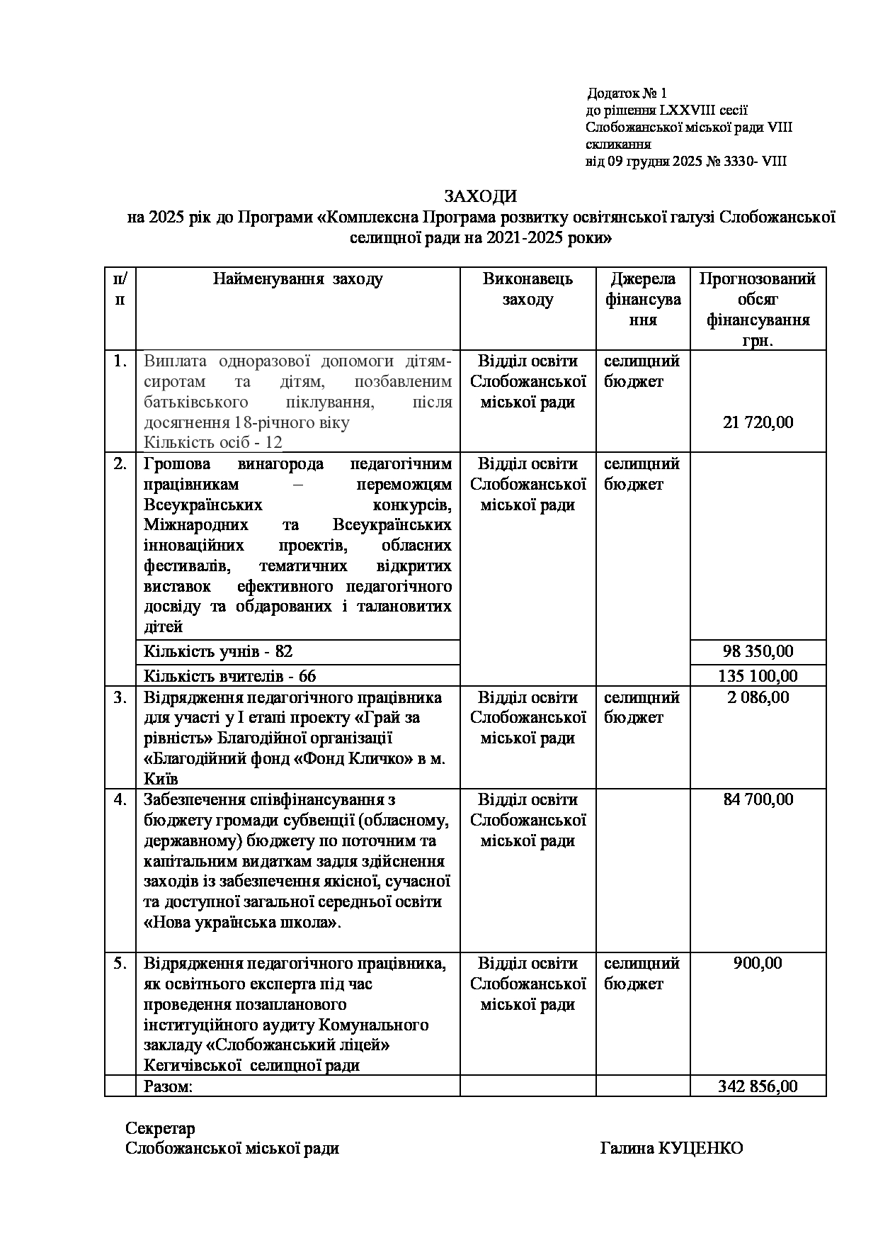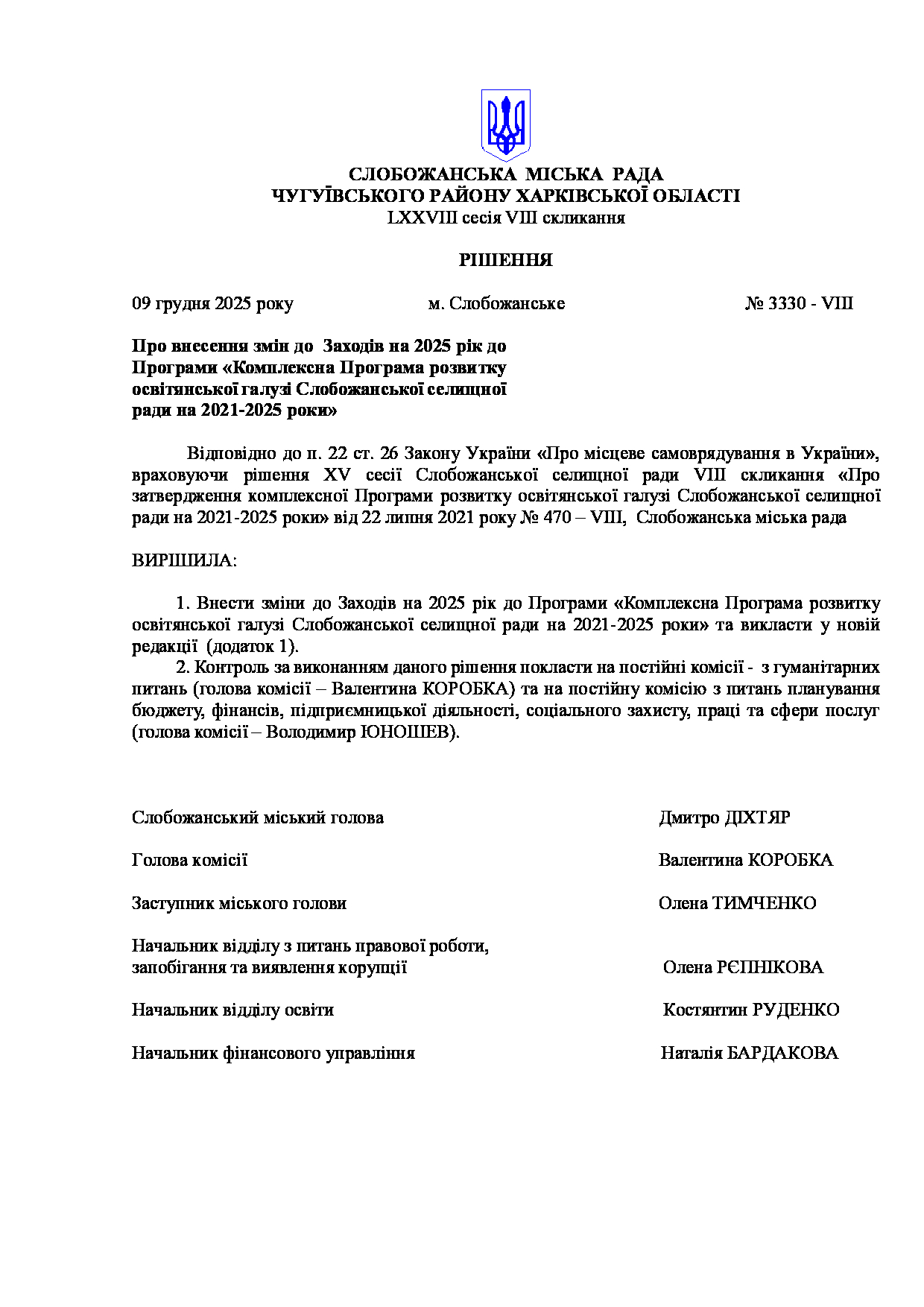 Текст рішення сесії №3330 Про внесення змін до Заходів на 2025 рік до Програми «Комплексна Програма розвитку освітянської галузі Слобожанської селищної ради на 2021-2025 роки»