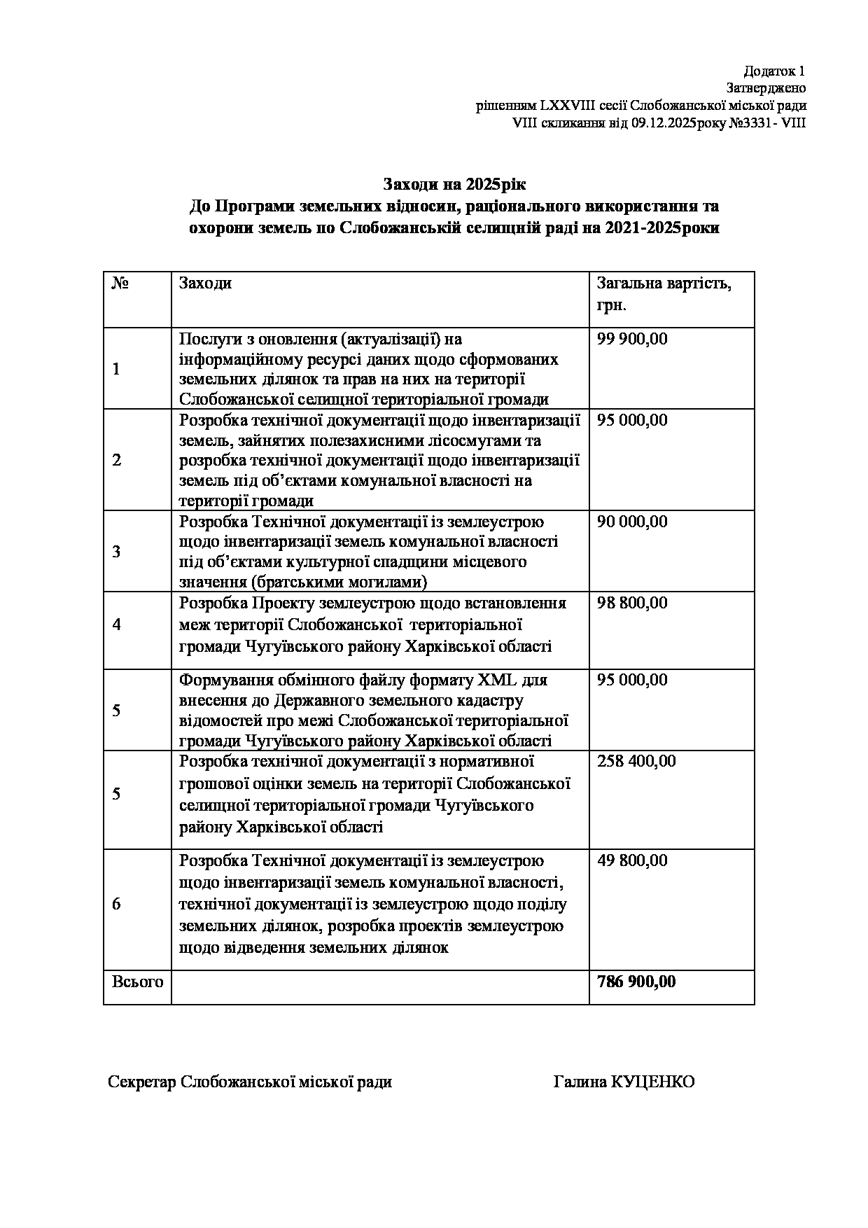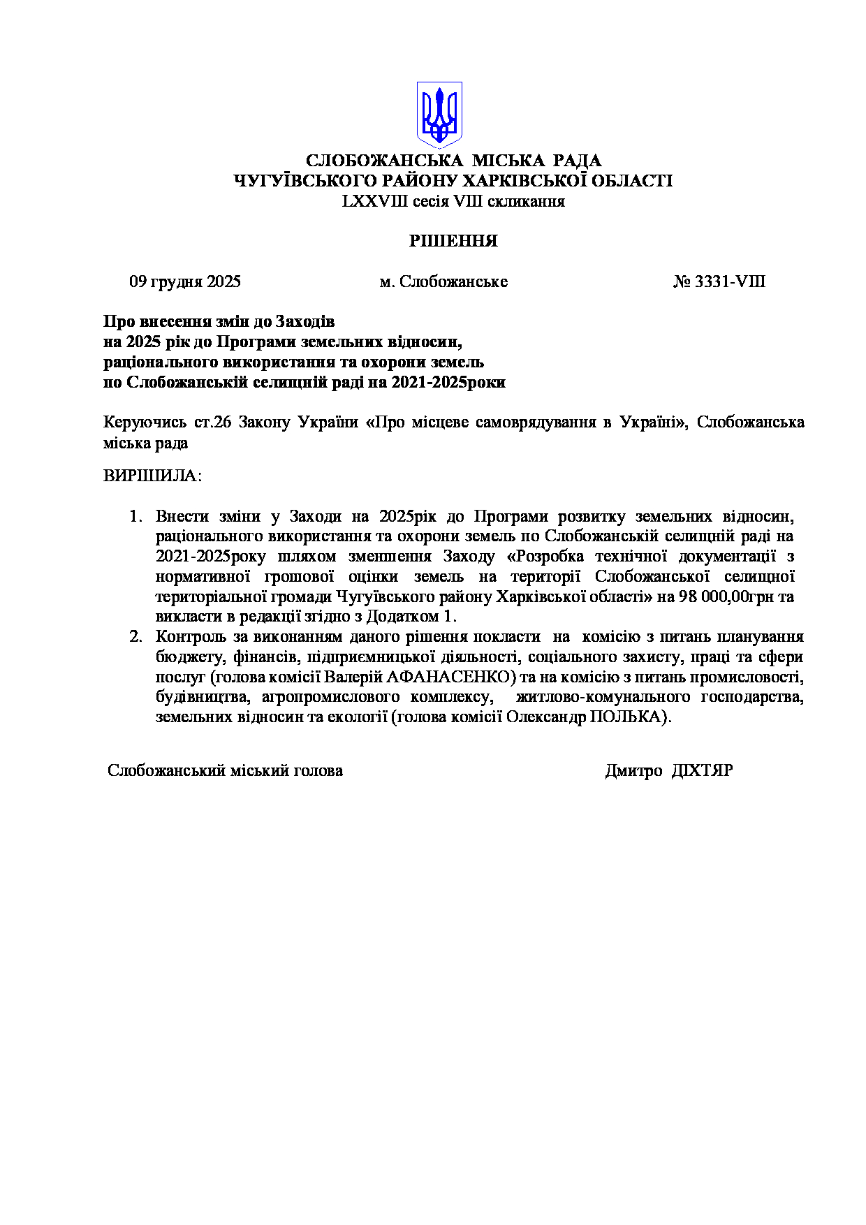 Текст рішення сесії №3331 Про внесення змін до Заходів на 2025 рік до Програми земельних відносин, раціонального використання та охорони земель по Слобожанській селищній раді на 2021-2025роки