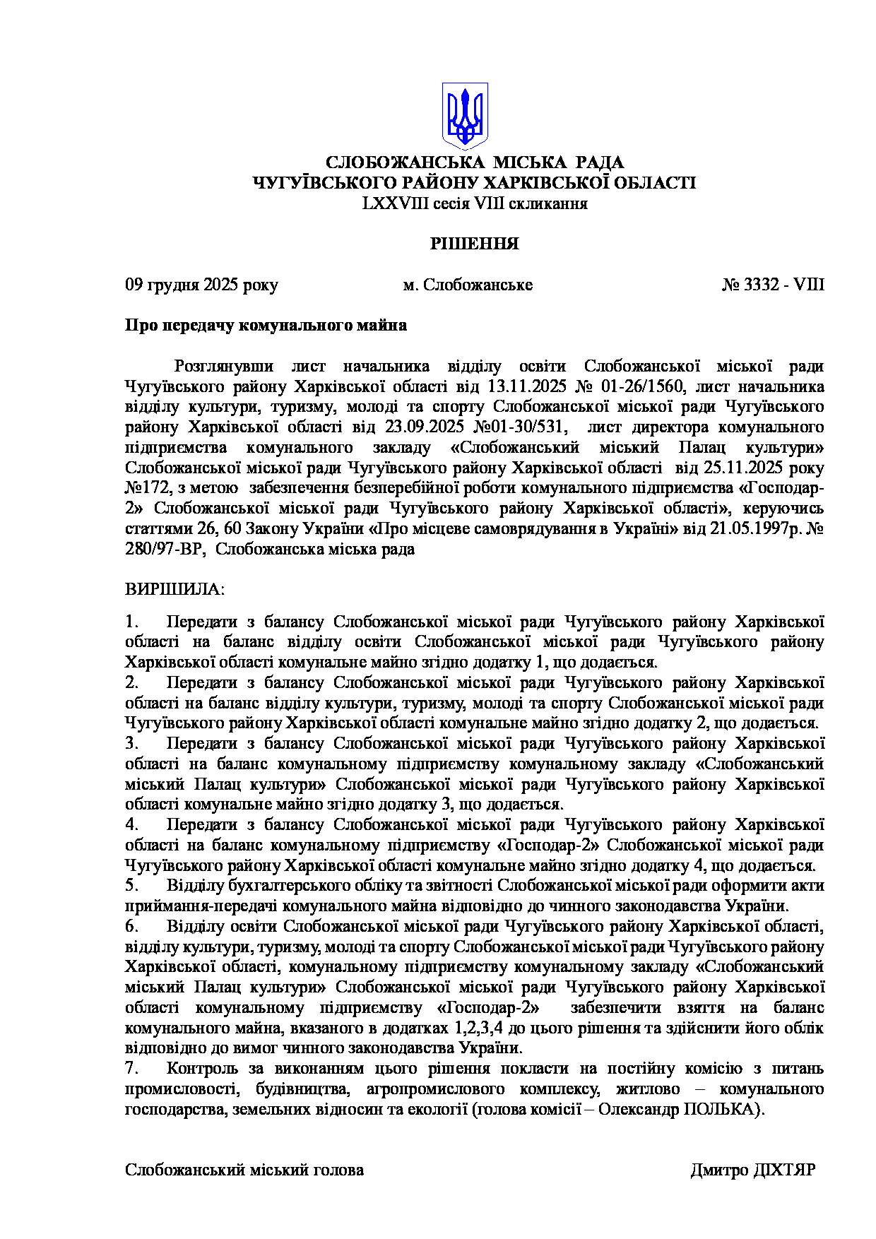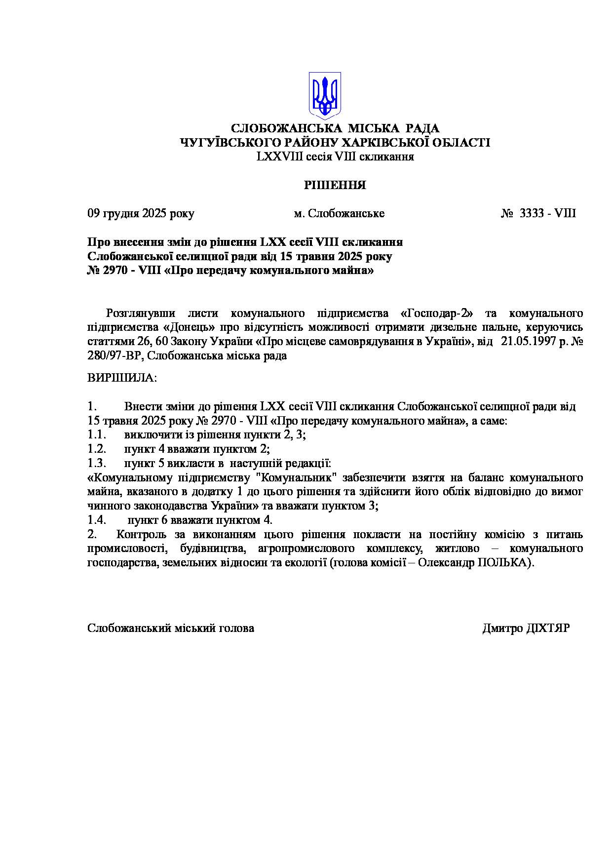Текст рішення сесії №3333 Про внесення змін до рішення LХX сесії VIІI скликання Слобожанської селищної ради від 15 травня 2025 року № 2970 - VIІI «Про передачу комунального майна»