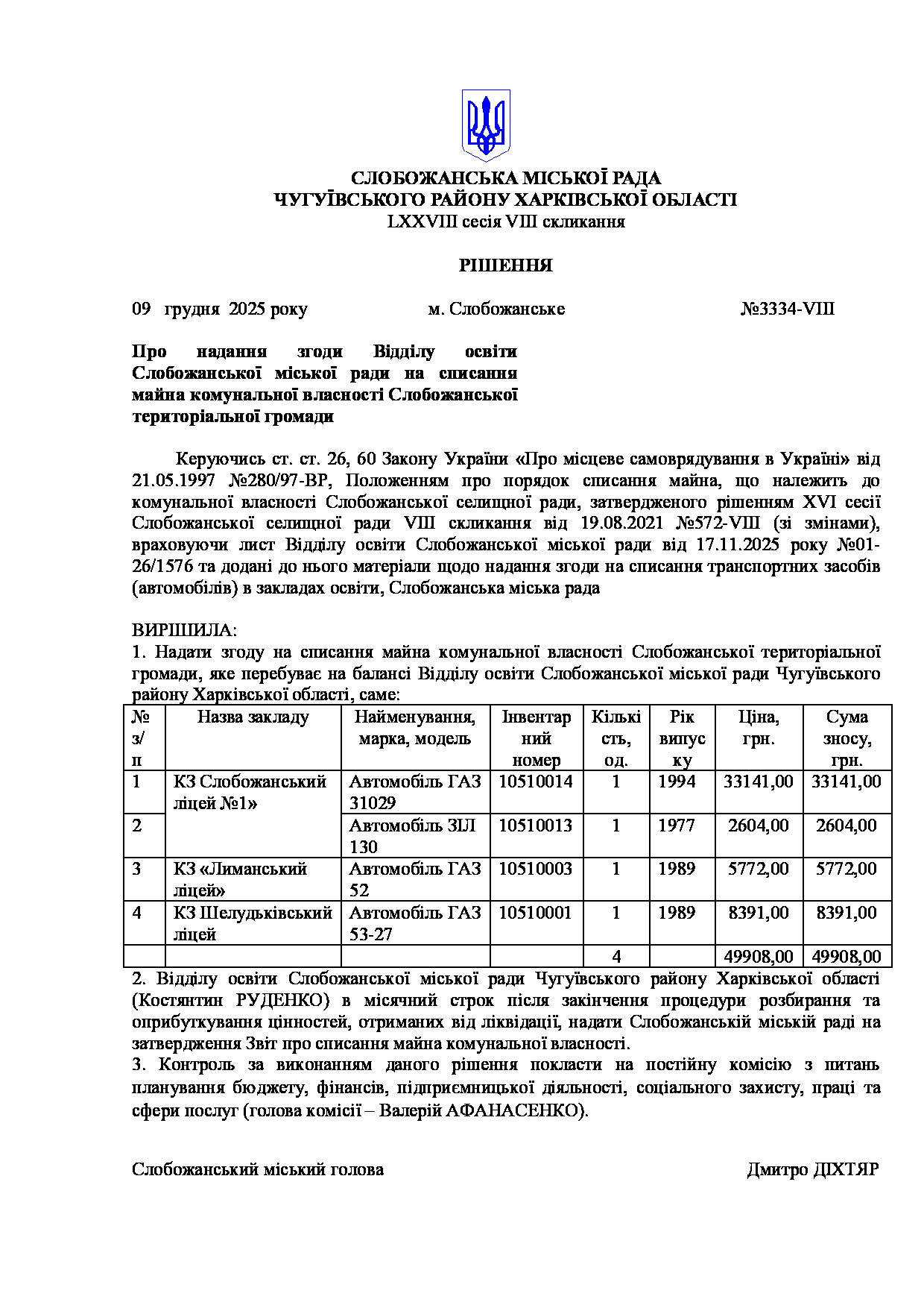Текст рішення сесії №3334 Про надання згоди Відділу освіти Слобожанської міської ради на списання майна комунальної власності Слобожанської територіальної громади