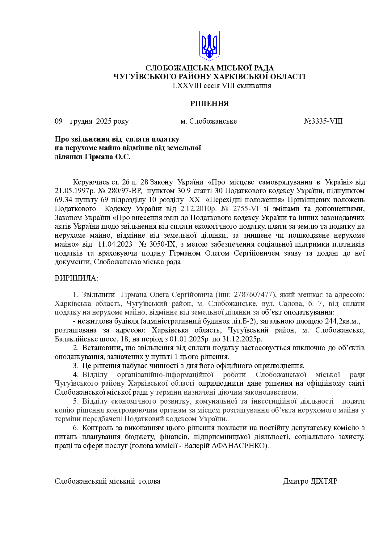 Текст рішення сесії №3335 Про звільнення від сплати податку на нерухоме майно відмінне від земельної ділянки Гірмана О.С