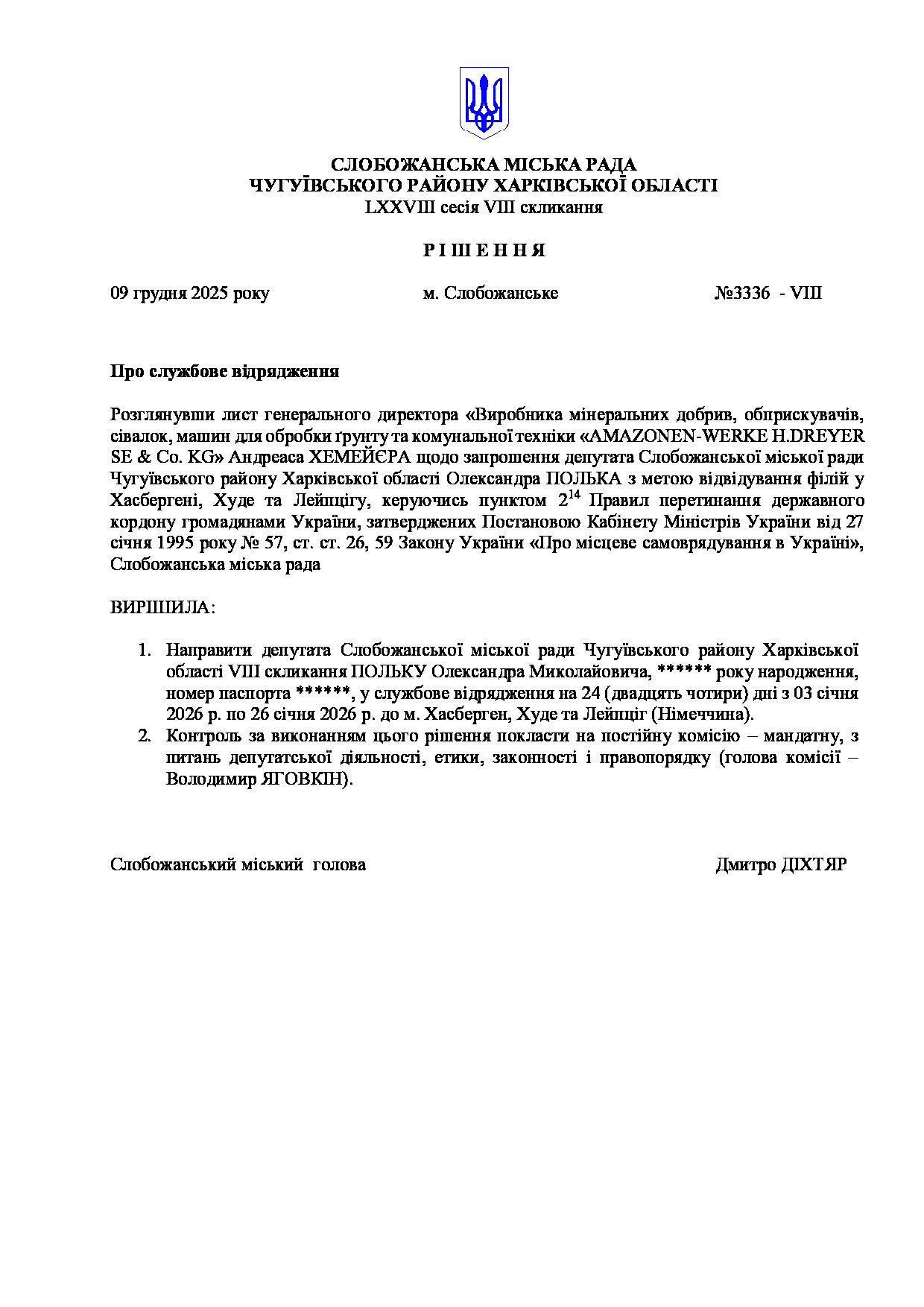Текст рішення сесії №3336 Про службове відрядження