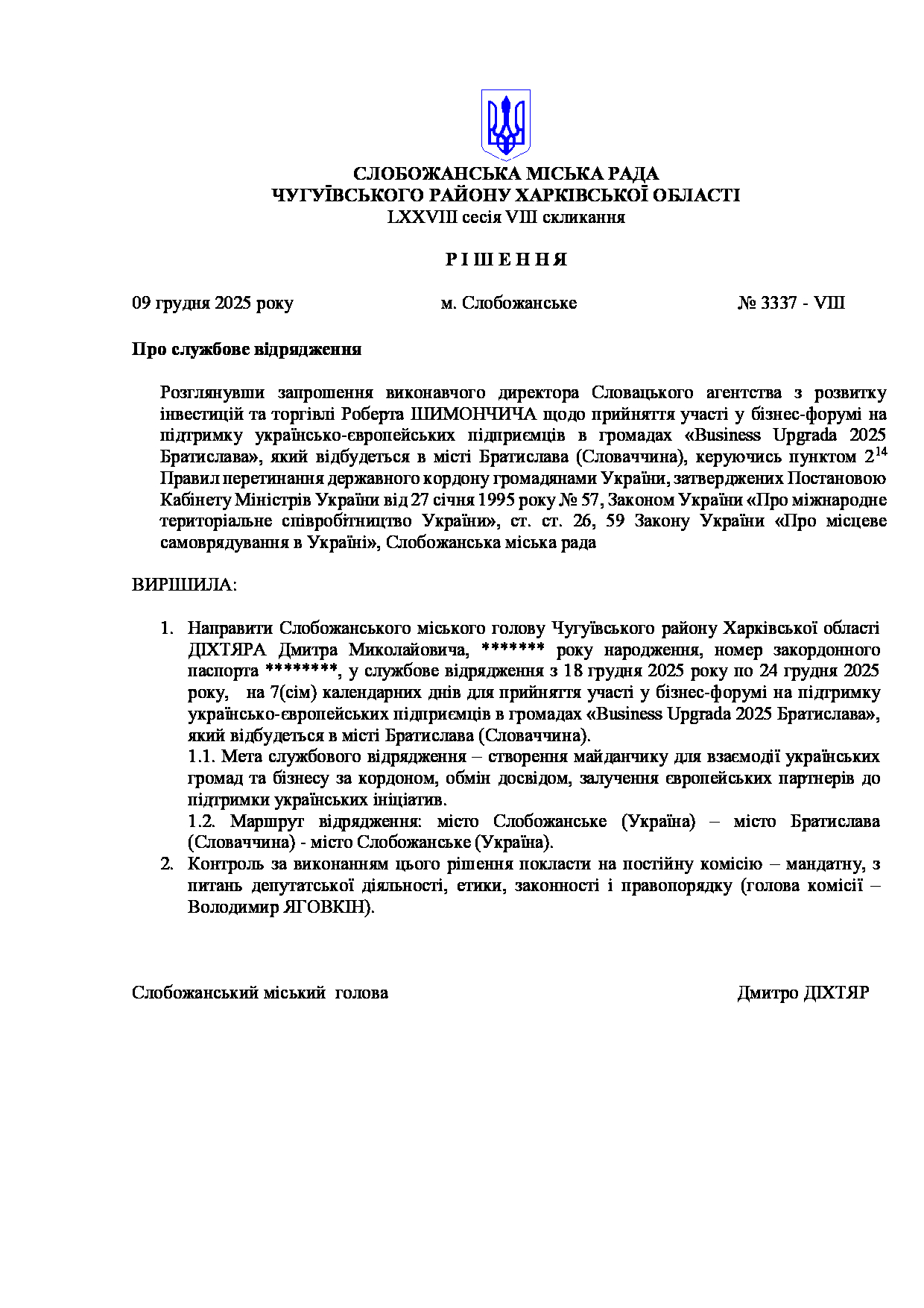 Текст рішення сесії №3337 Про службове відрядження