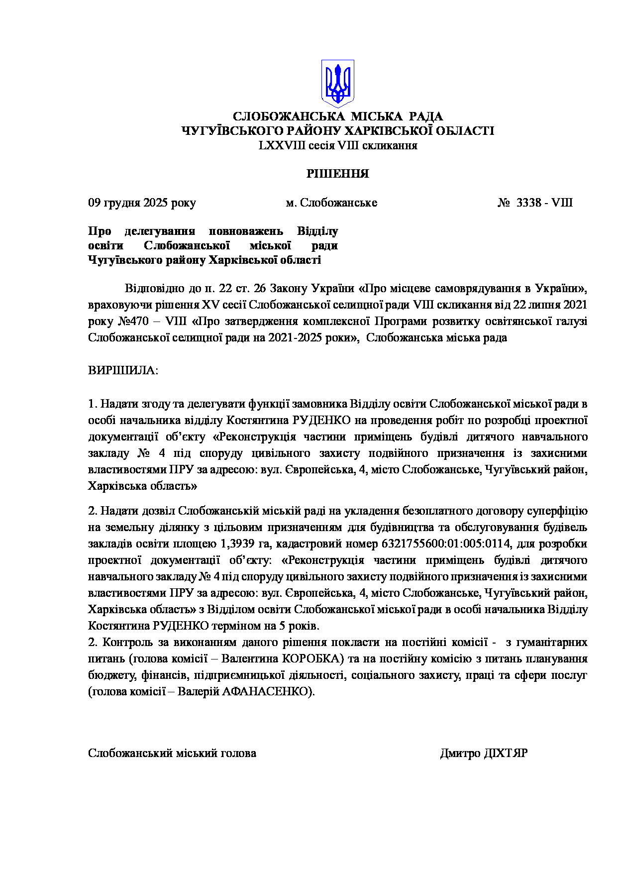 Текст рішення сесії №3338 Про делегування повноважень відділу освіти Слобожанської міської ради