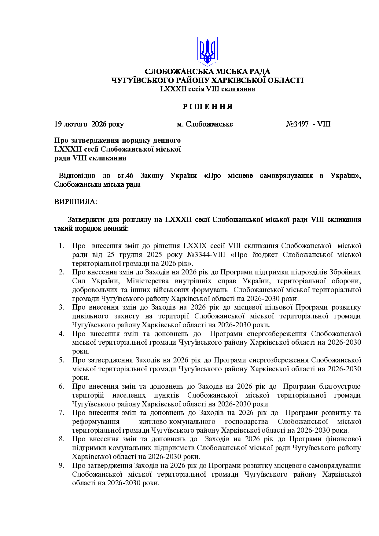 Текст рішення сесії №3497 Про затвердження порядку денного LХХХІІ сесії Слобожанської міської ради VІIІ скликання
