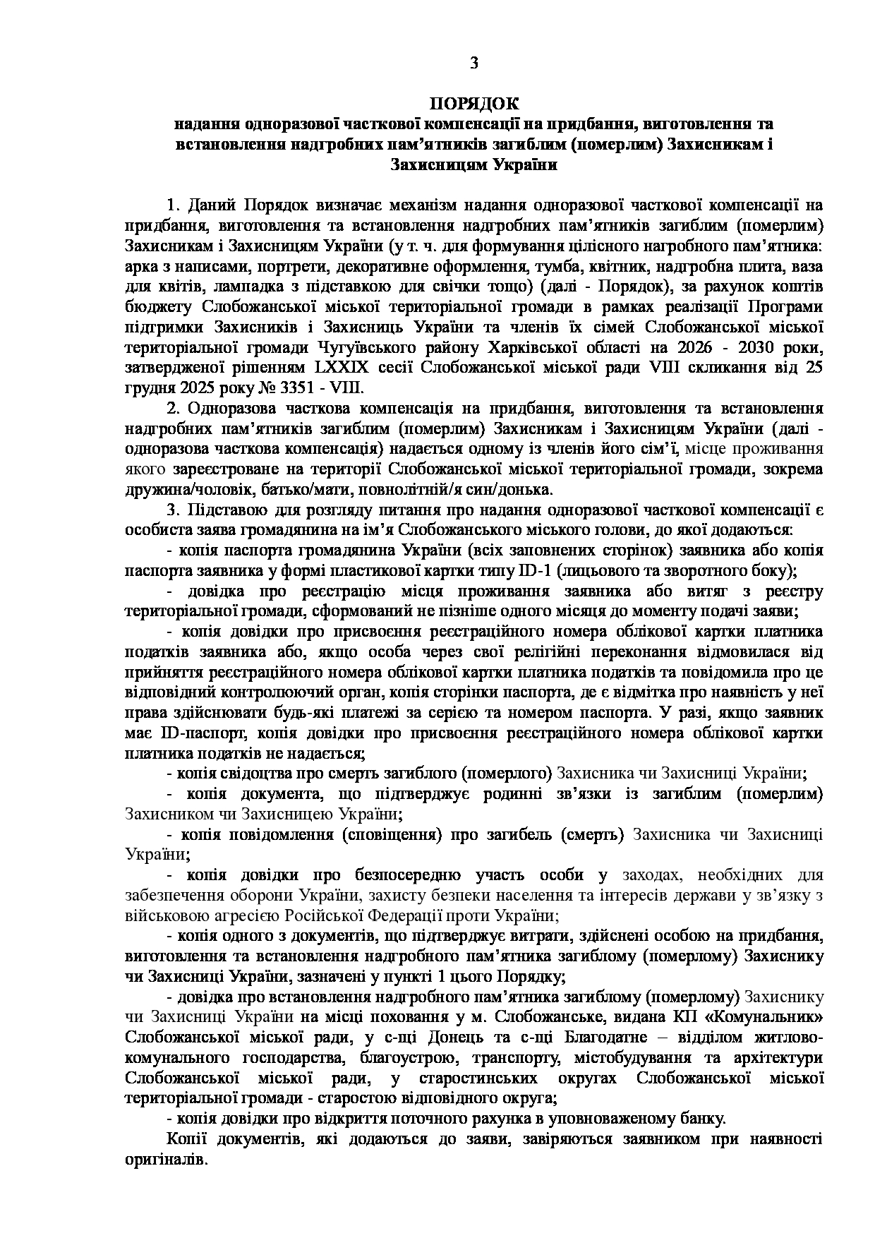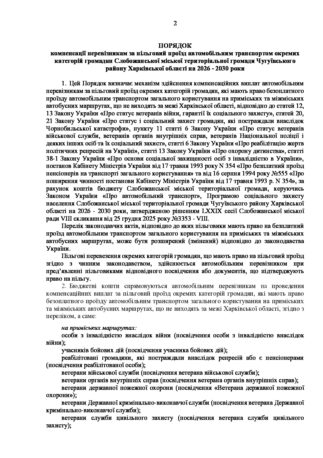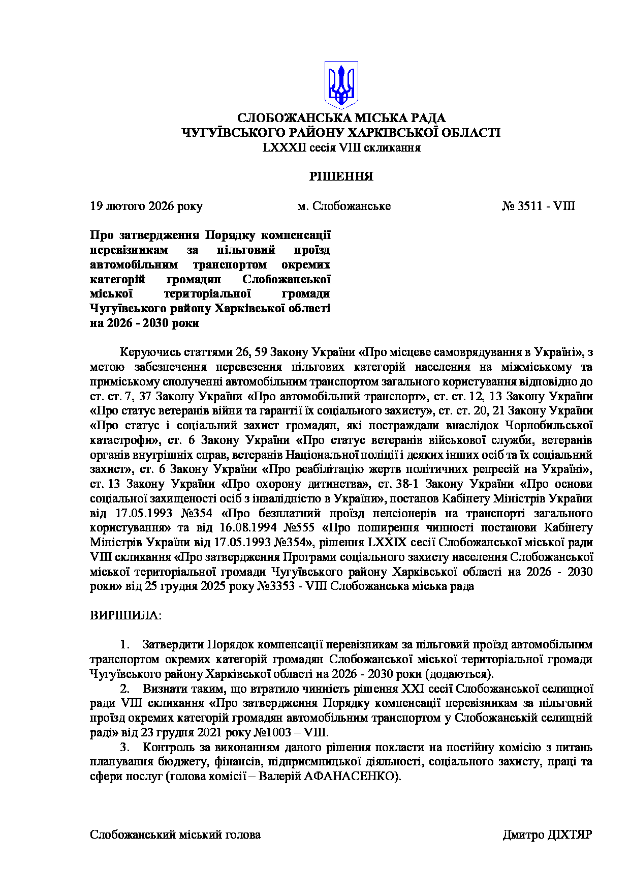 Текст рішення сесії №3511 Про затвердження Порядку компенсації перевізникам за пільговий проїзд автомобільним транспортом окремих категорій громадян Слобожанської міської територіальної громади Чугуївського району Харківської області на 2026 - 2030 роки.