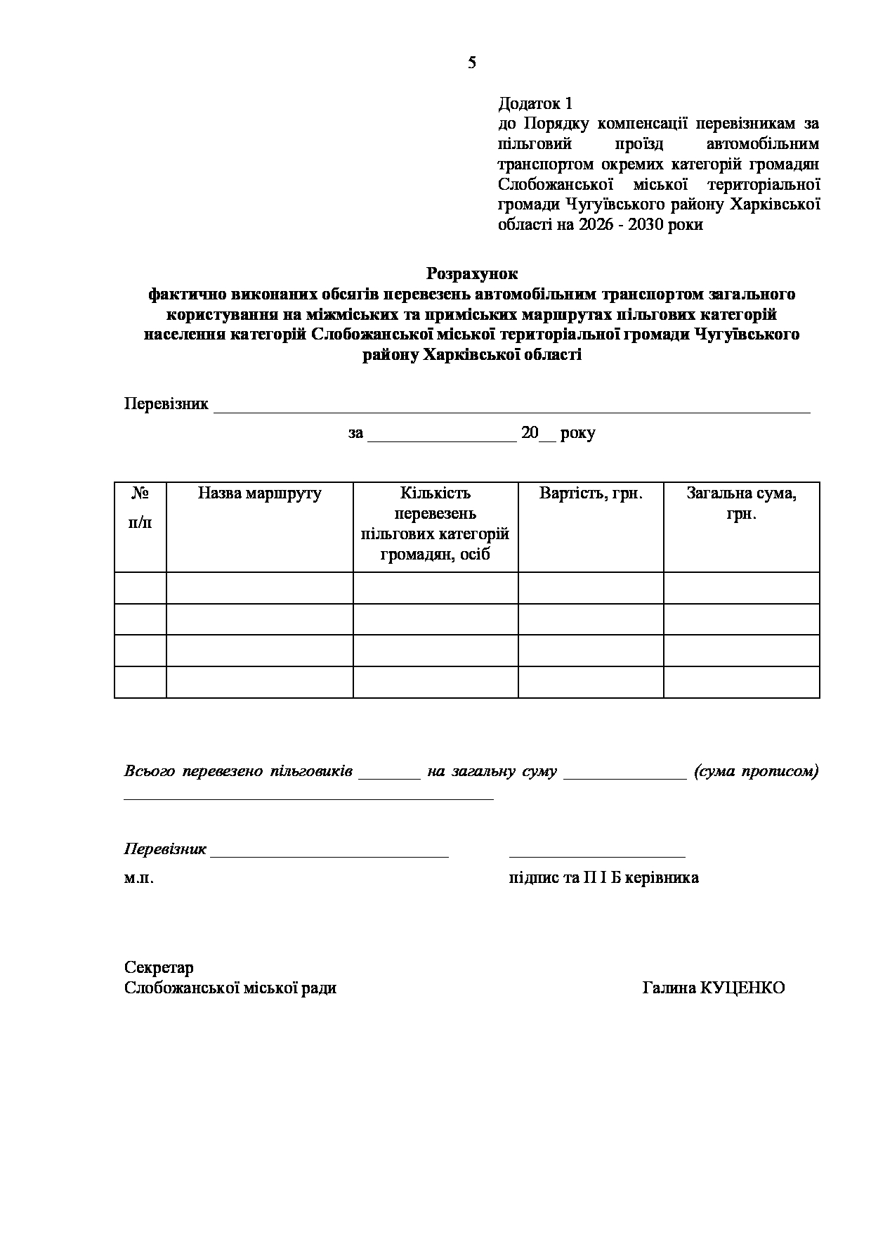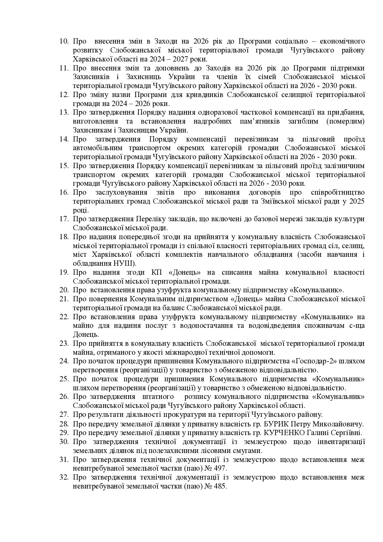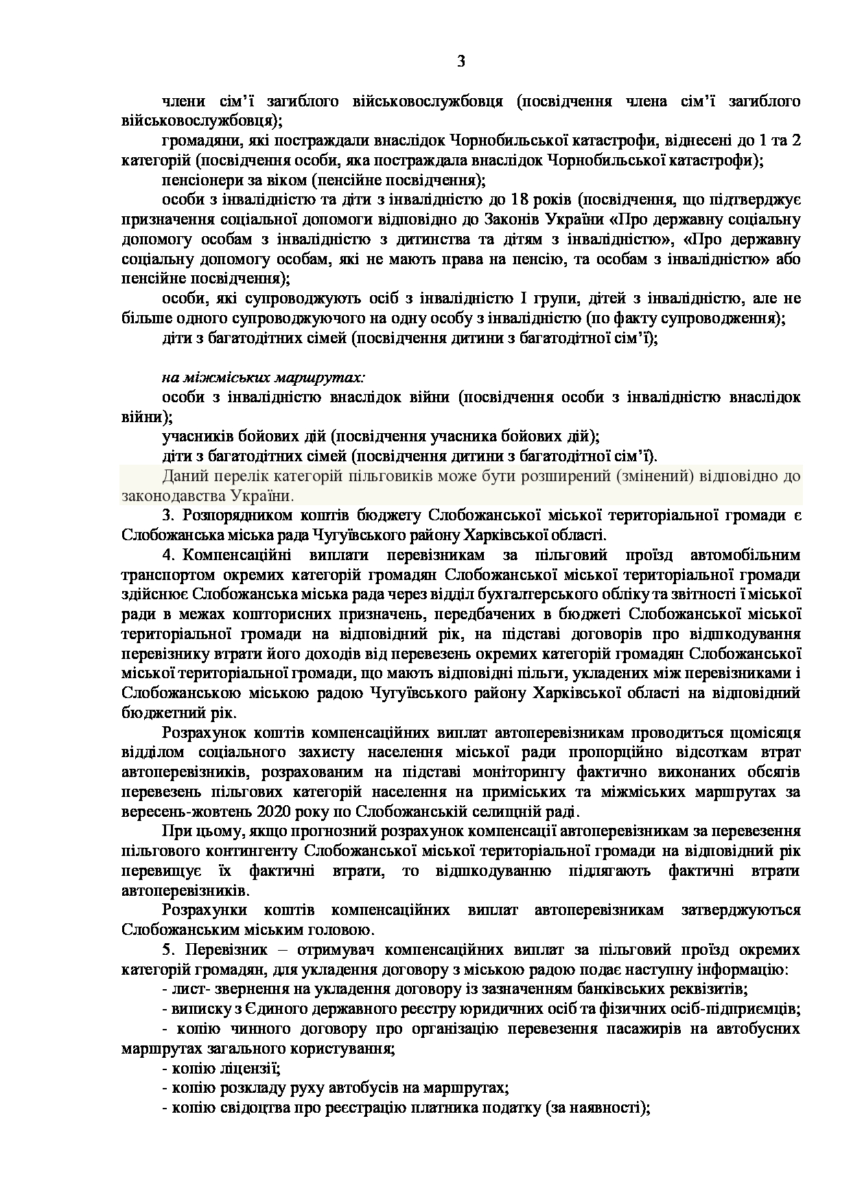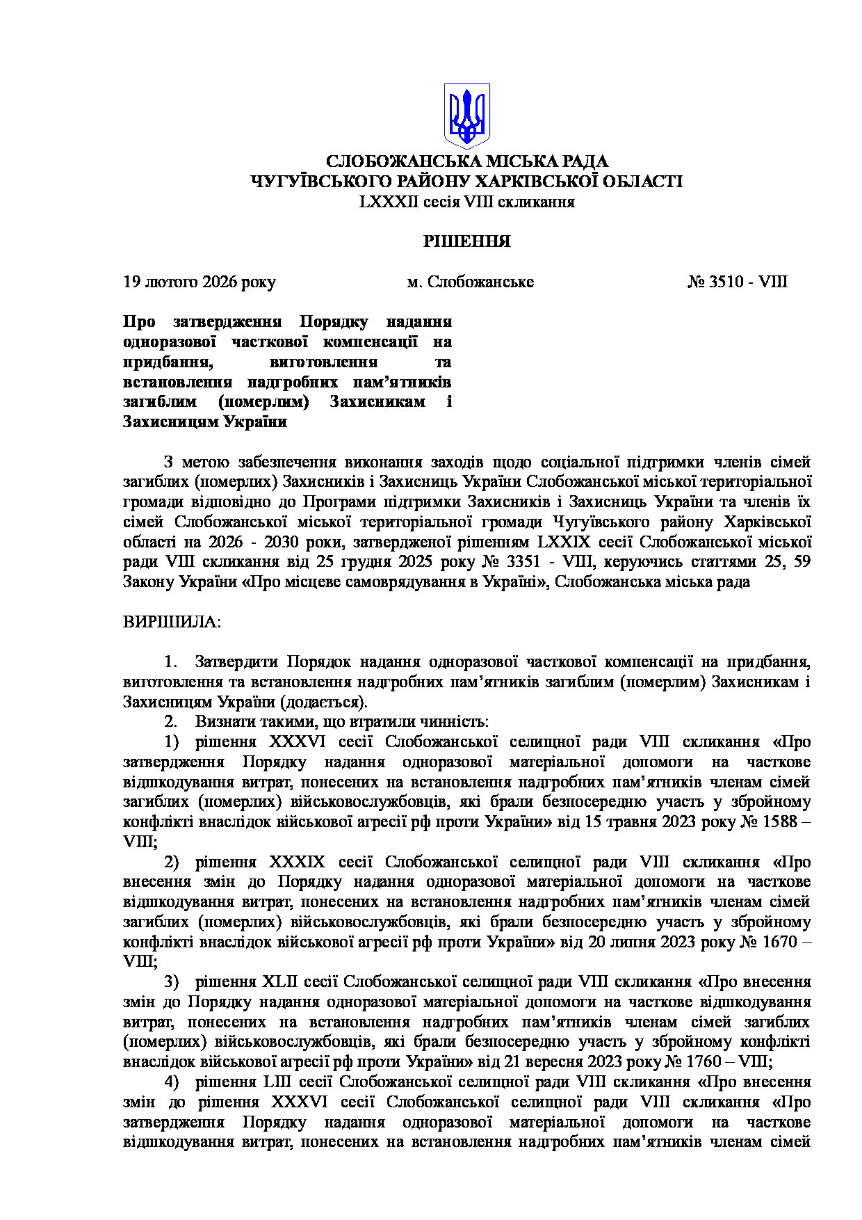 Текст рішення сесії №3511 Про затвердження Порядку компенсації перевізникам за пільговий проїзд автомобільним транспортом окремих категорій громадян Слобожанської міської територіальної громади Чугуївського району Харківської області на 2026 - 2030 роки.