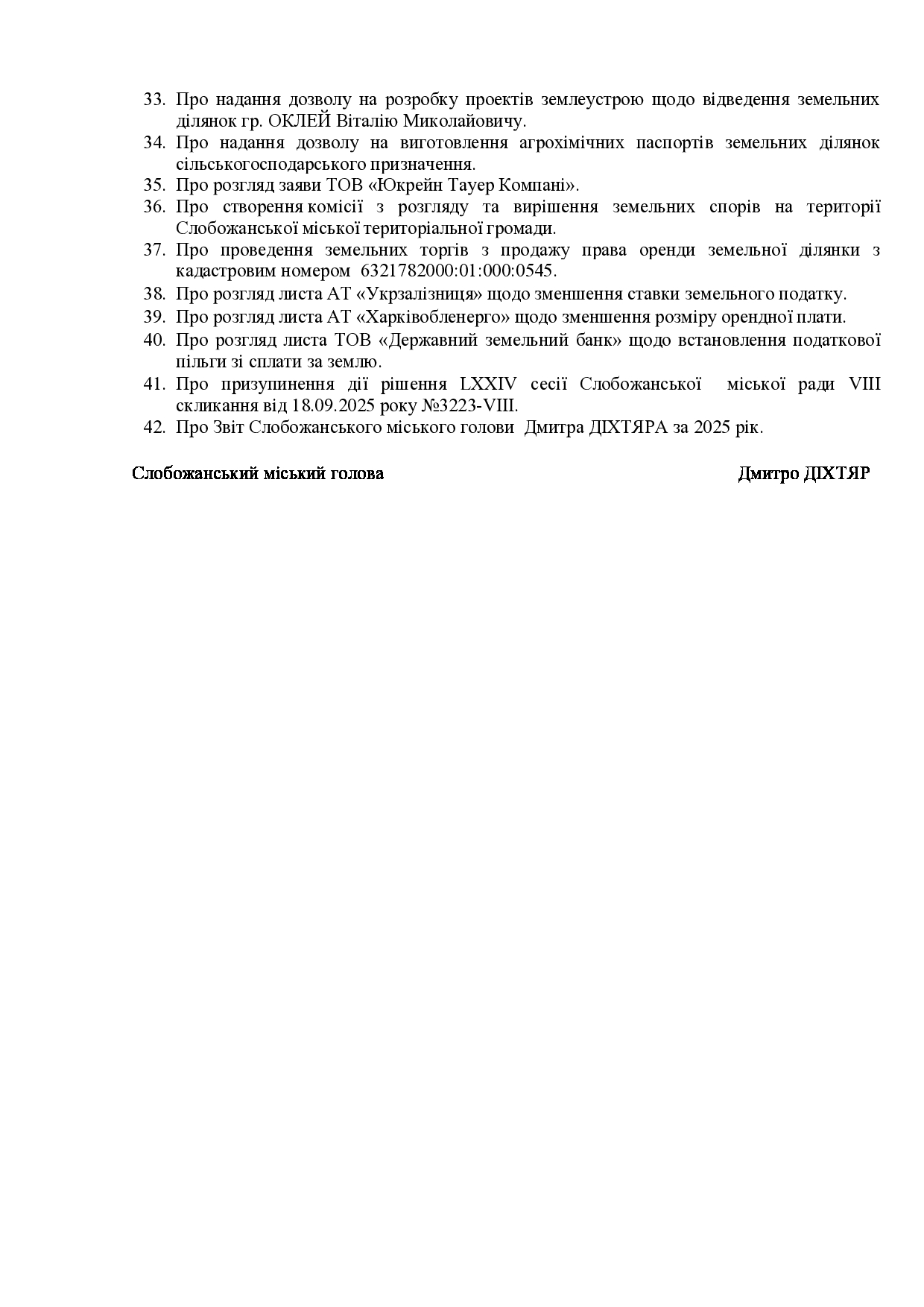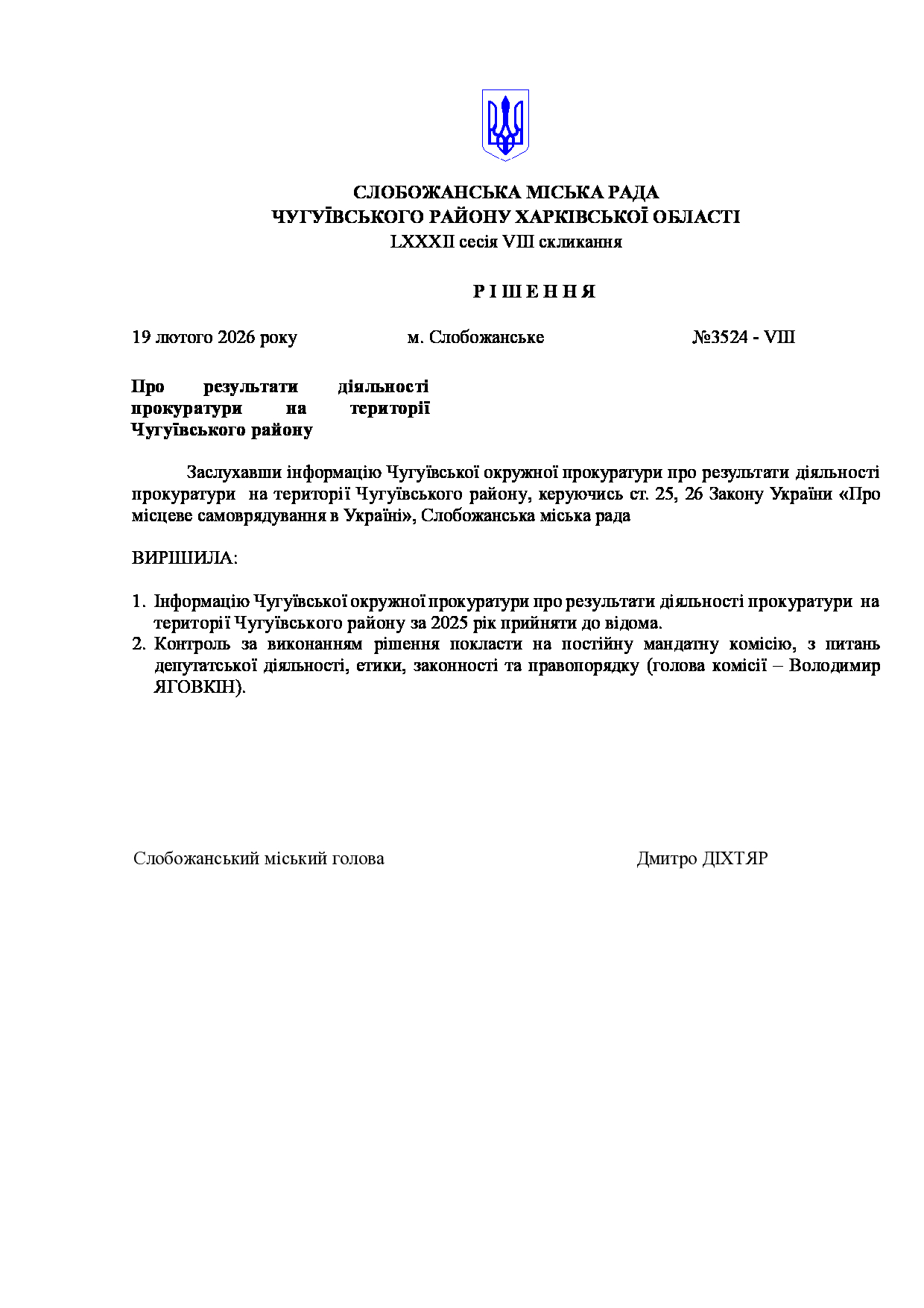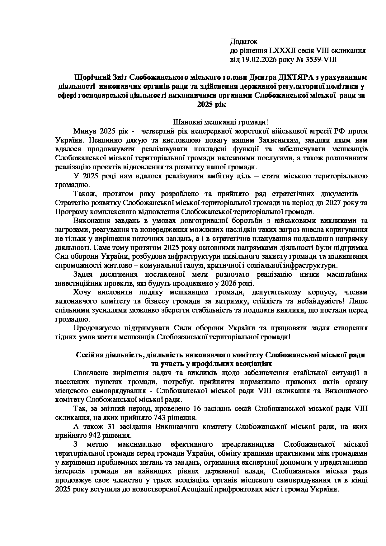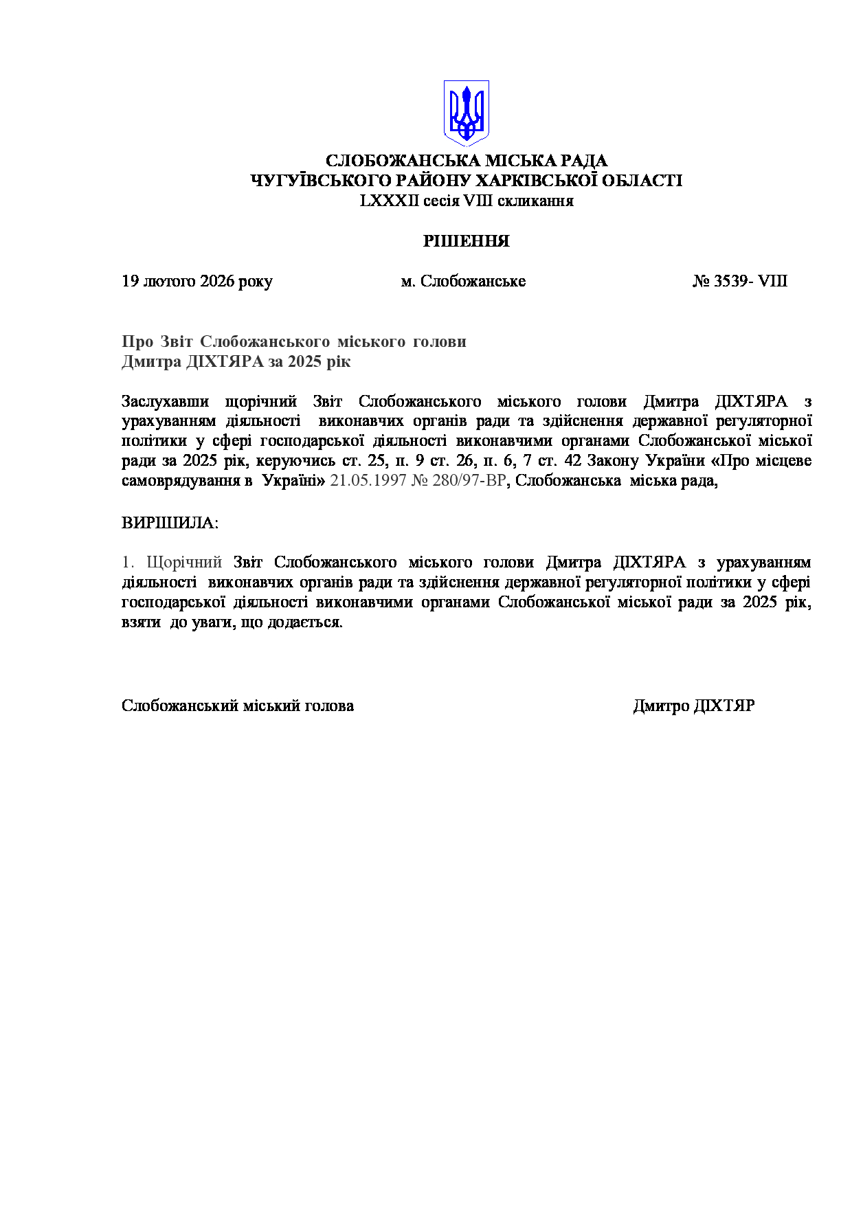 Текст рішення сесії №3539 Про Звіт Слобожанського міського голови Дмитра ДІХТЯРА за 2025 рік.
