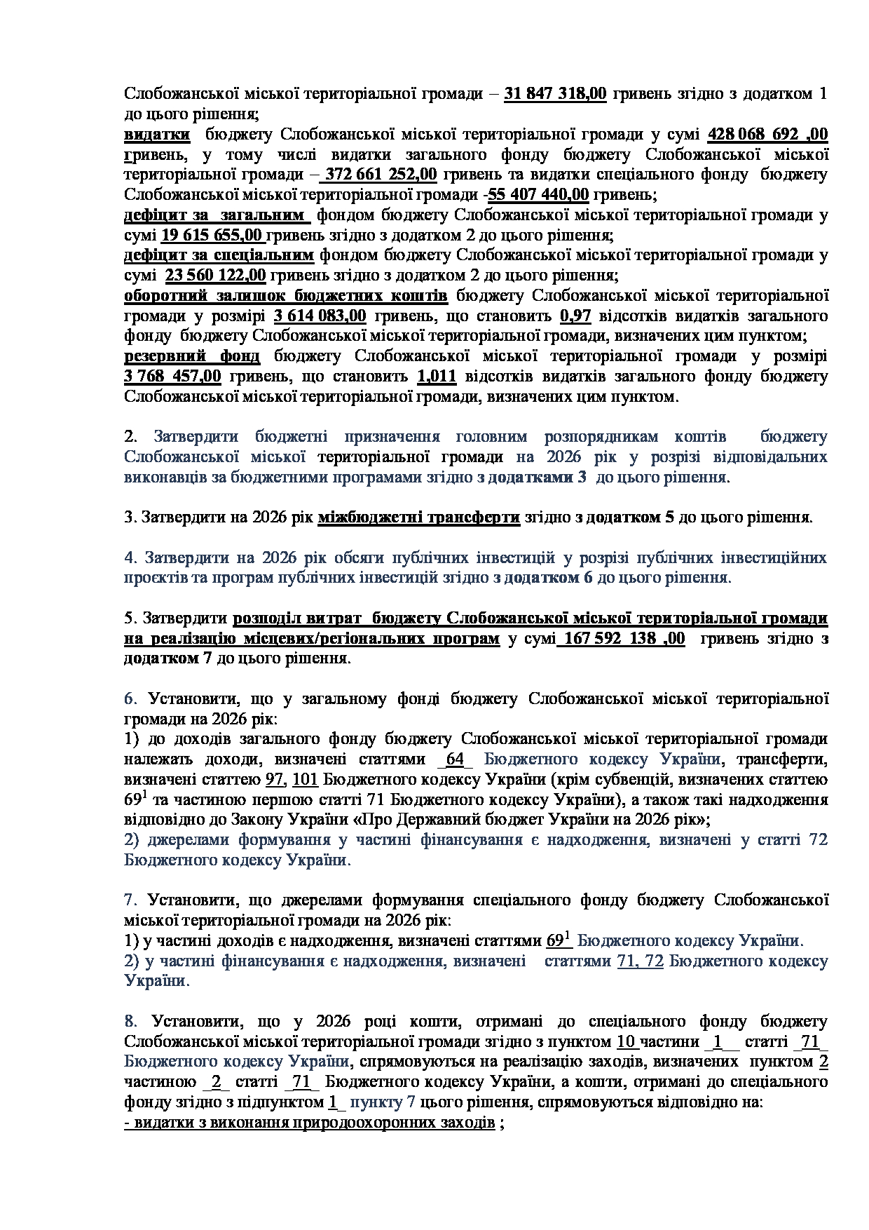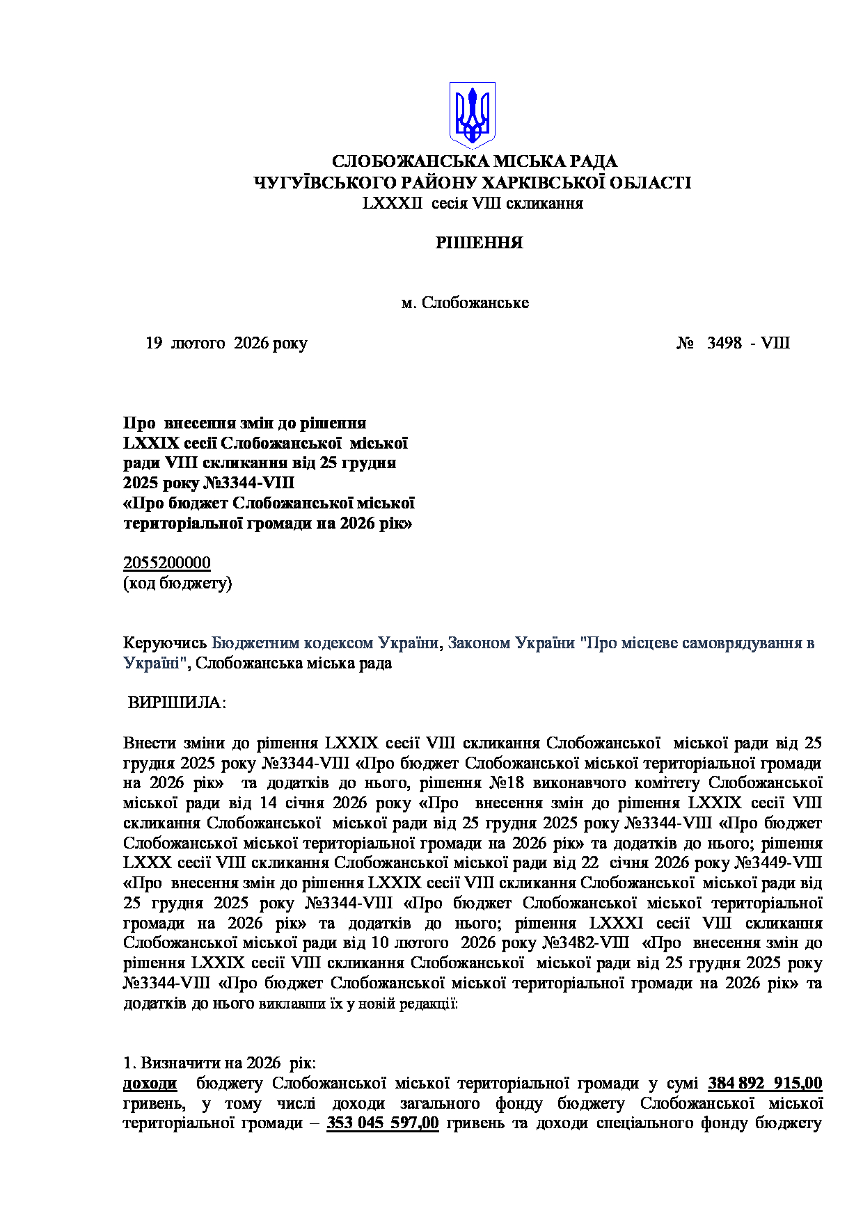 Текст рішення сесії №3498 Про внесення змін до рішення LXXIX сесії VIII скликання Слобожанської міської ради від 25 грудня 2025 року №3344-VIII «Про бюджет Слобожанської міської територіальної громади на 2026 рік».