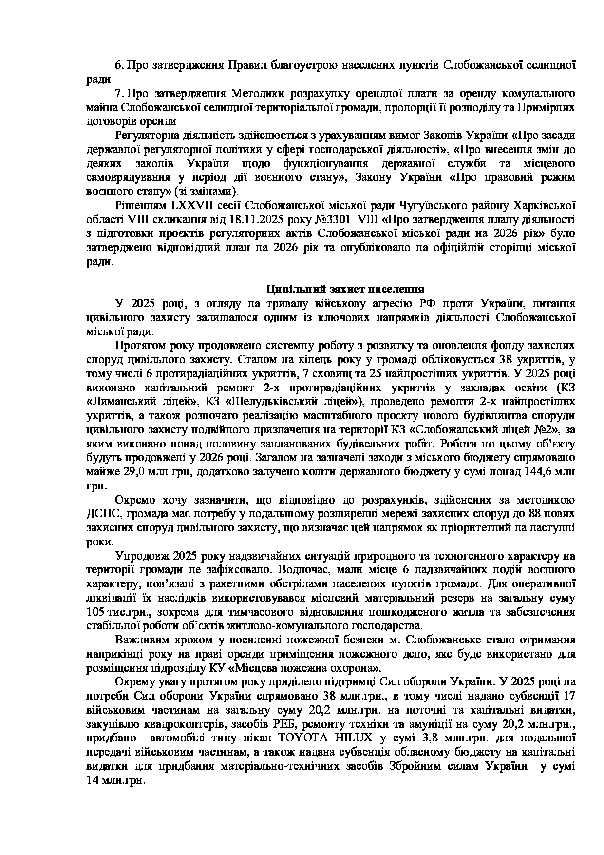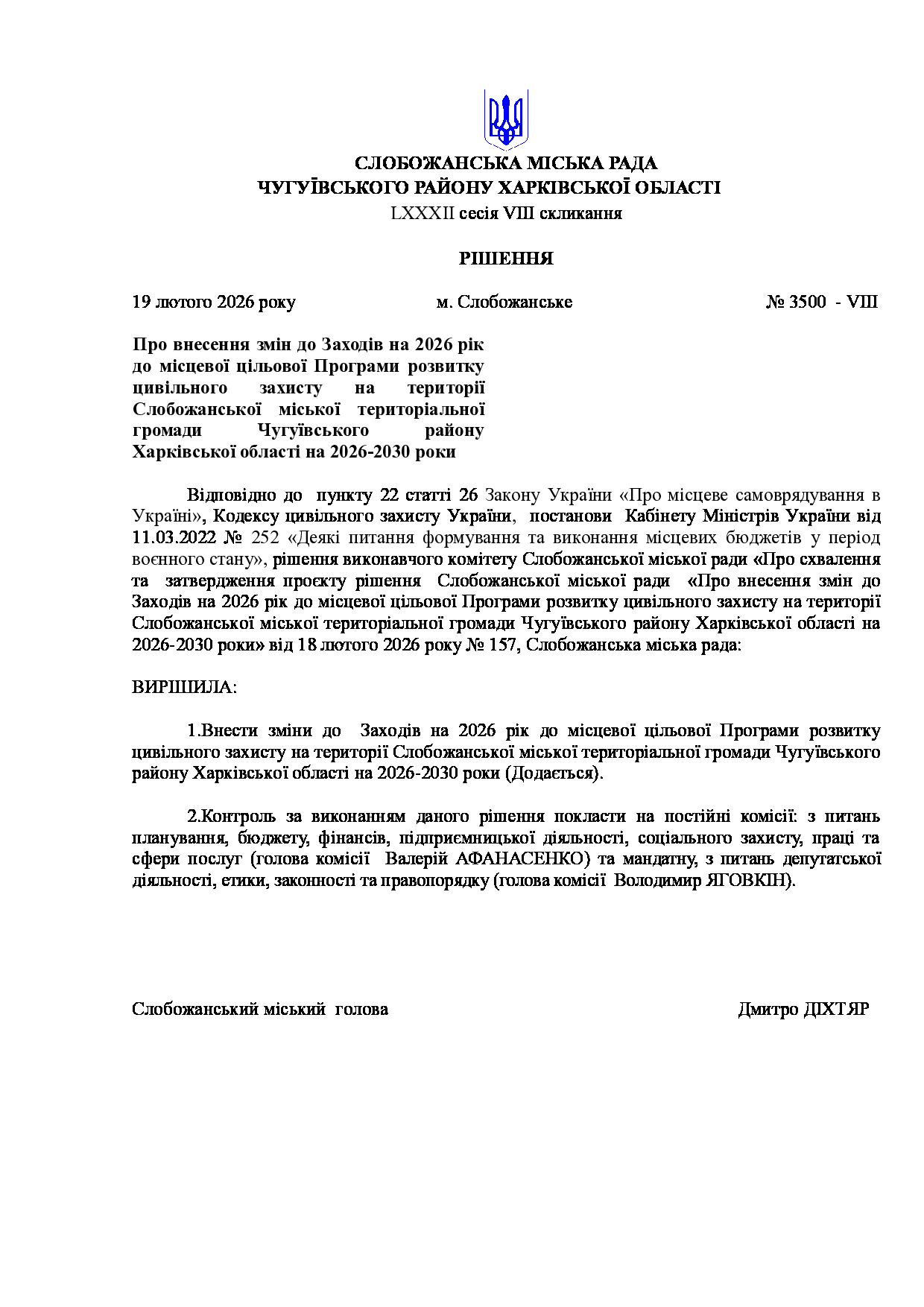 Текст рішення сесії №3500 Про внесення змін до Заходів на 2026 рік до місцевої цільової Програми розвитку цивільного захисту на території Слобожанської міської територіальної громади Чугуївського району Харківської області на 2026-2030 роки.