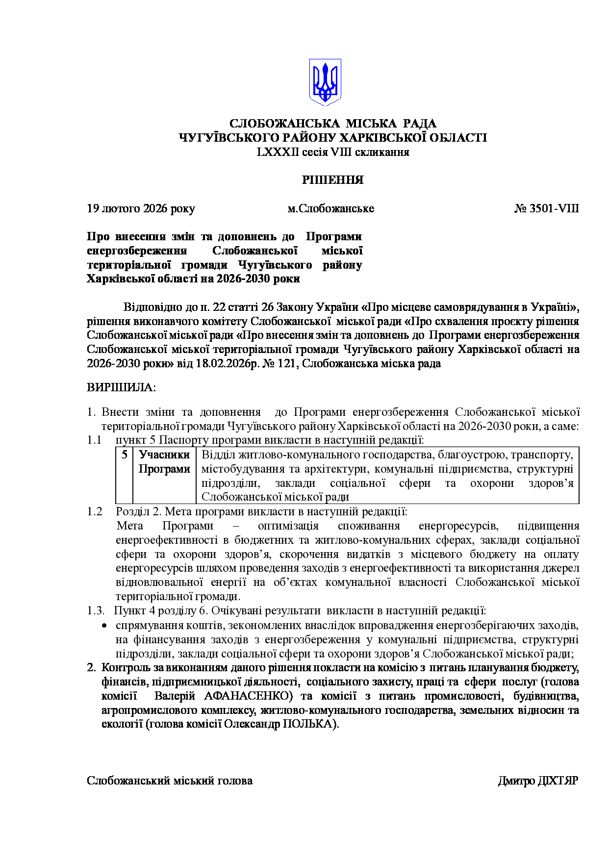 Текст рішення сесії №3501 Про внесення змін та доповнень до Програми енергозбереження Слобожанської міської територіальної громади Чугуївського району Харківської області на 2026-2030 роки.