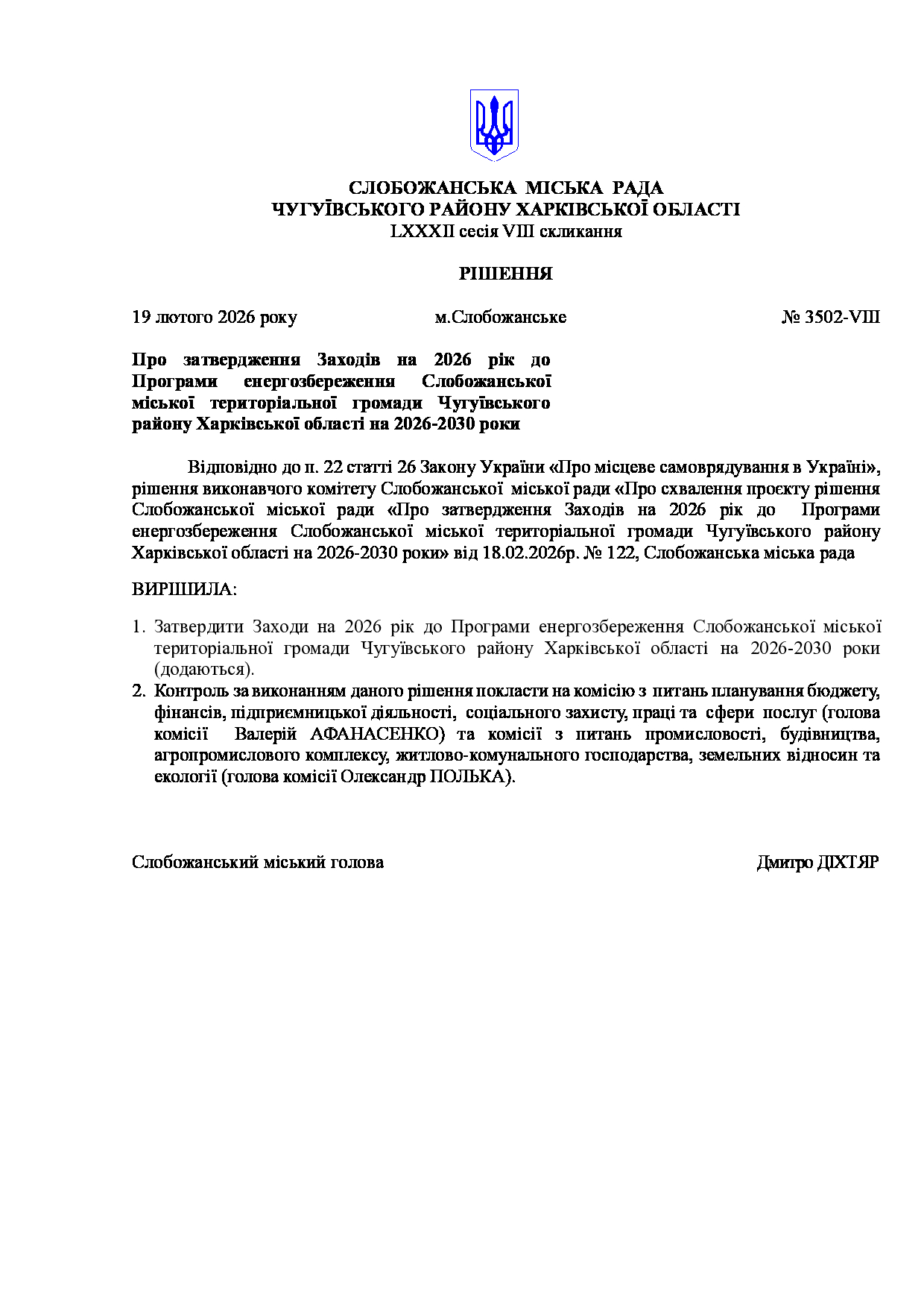 Текст рішення сесії №3502 Про затвердження Заходів на 2026 рік до Програми енергозбереження Слобожанської міської територіальної громади Чугуївського району Харківської області на 2026-2030 роки.