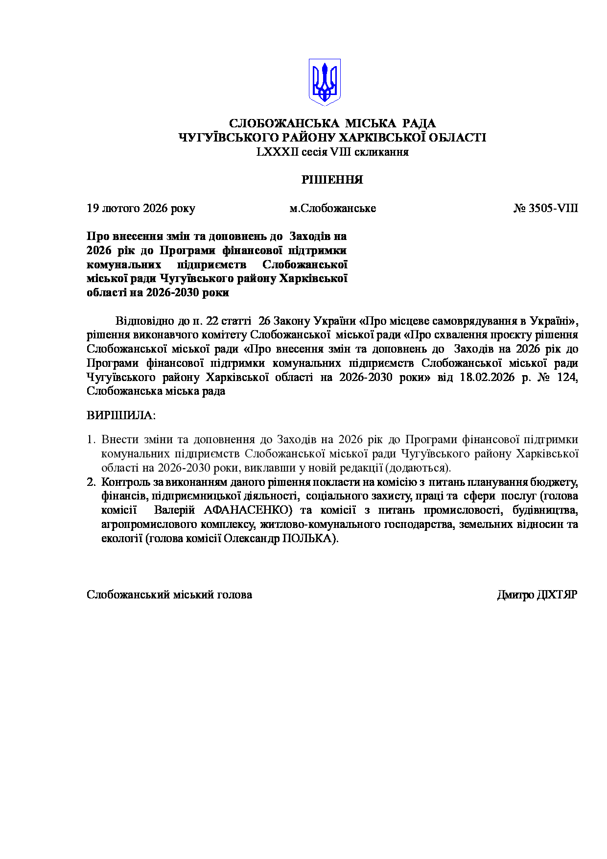 Текст рішення сесії №3505 Про внесення змін та доповнень до Заходів на 2026 рік до Програми фінансової підтримки комунальних підприємств Слобожанської міської ради Чугуївського району Харківської області на 2026-2030 роки.