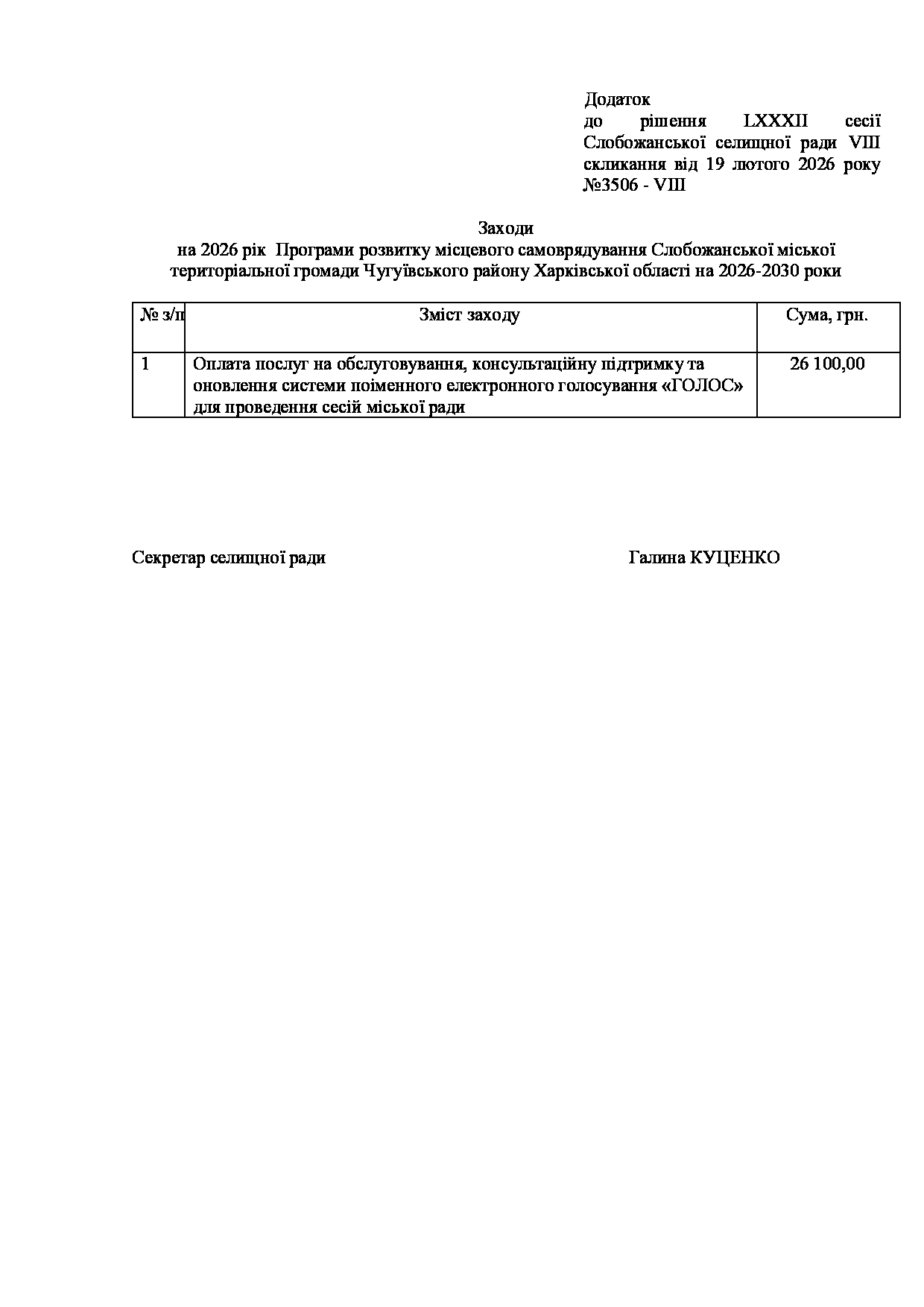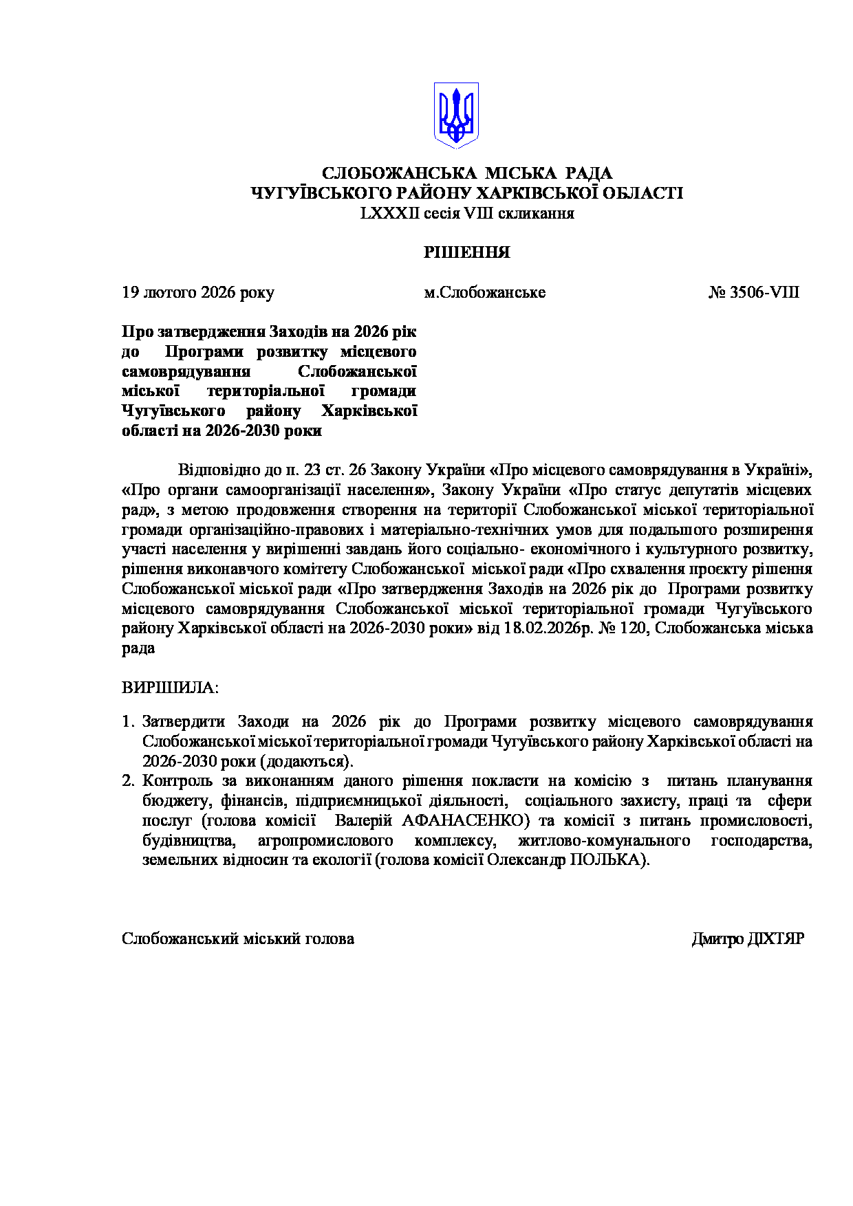 Текст рішення сесії №3506 Про затвердження Заходів на 2026 рік до Програми розвитку місцевого самоврядування Слобожанської міської територіальної громади Чугуївського району Харківської області на 2026-2030 роки.