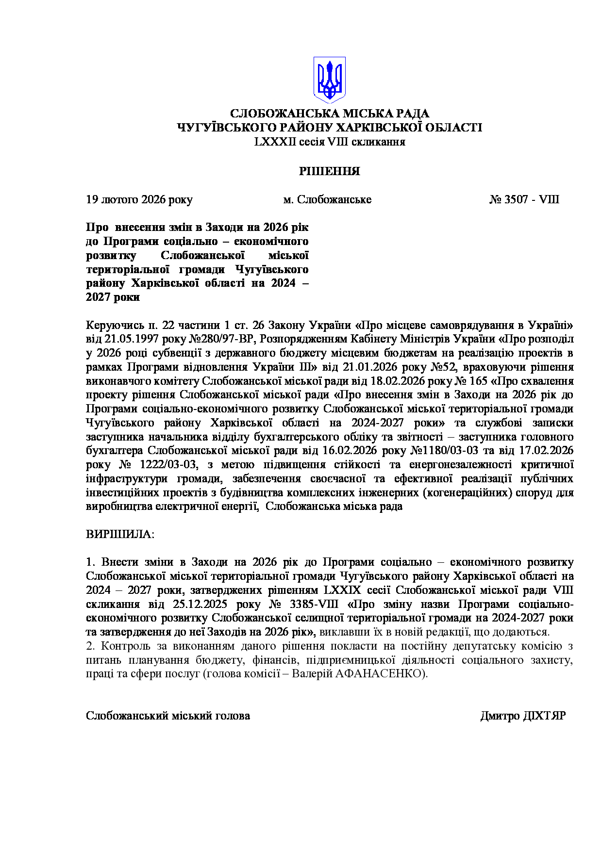 Текст рішення сесії №3507 Про внесення змін в Заходи на 2026 рік до Програми соціально – економічного розвитку Слобожанської міської територіальної громади Чугуївського району Харківської області на 2024 – 2027 роки.