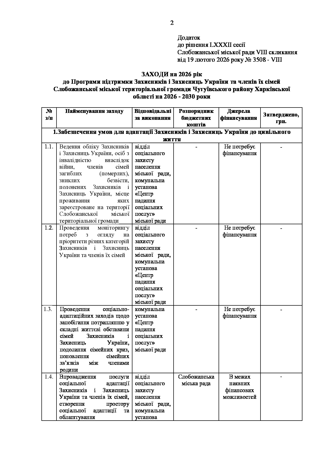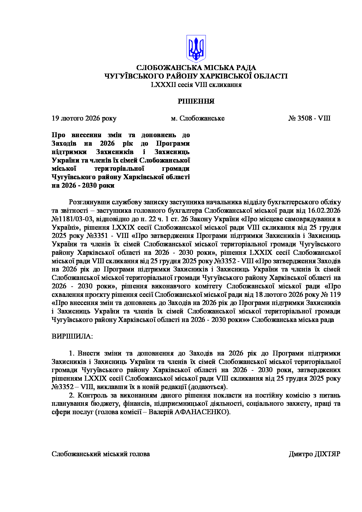 Текст рішення сесії №3508 Про внесення змін та доповнень до Заходів на 2026 рік до Програми підтримки Захисників і Захисниць України та членів їх сімей Слобожанської міської територіальної громади Чугуївського району Харківської області на 2026 - 2030 роки.