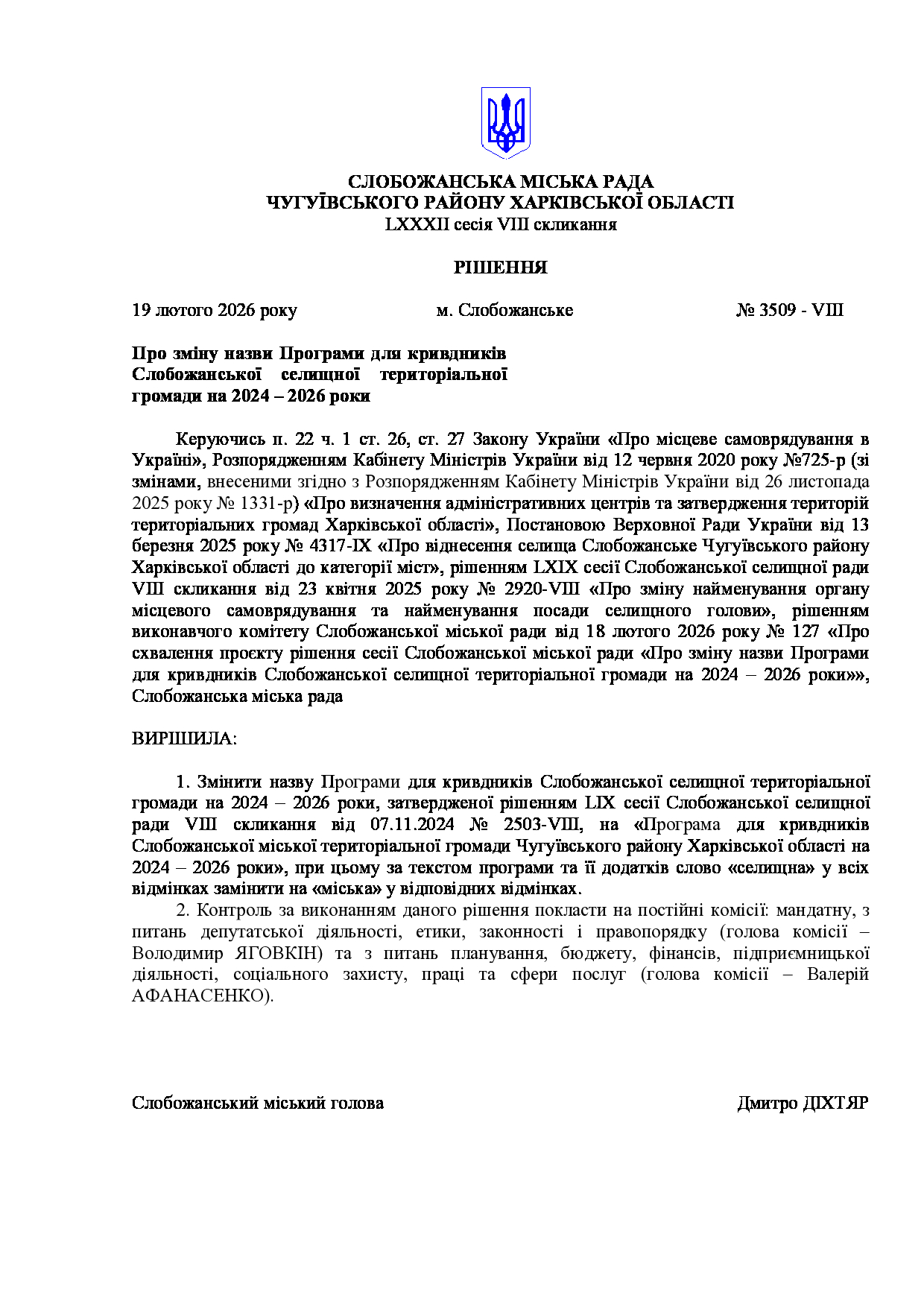 Текст рішення сесії №3509 Про зміну назви Програми для кривдників Слобожанської селищної територіальної громади на 2024 – 2026 роки.