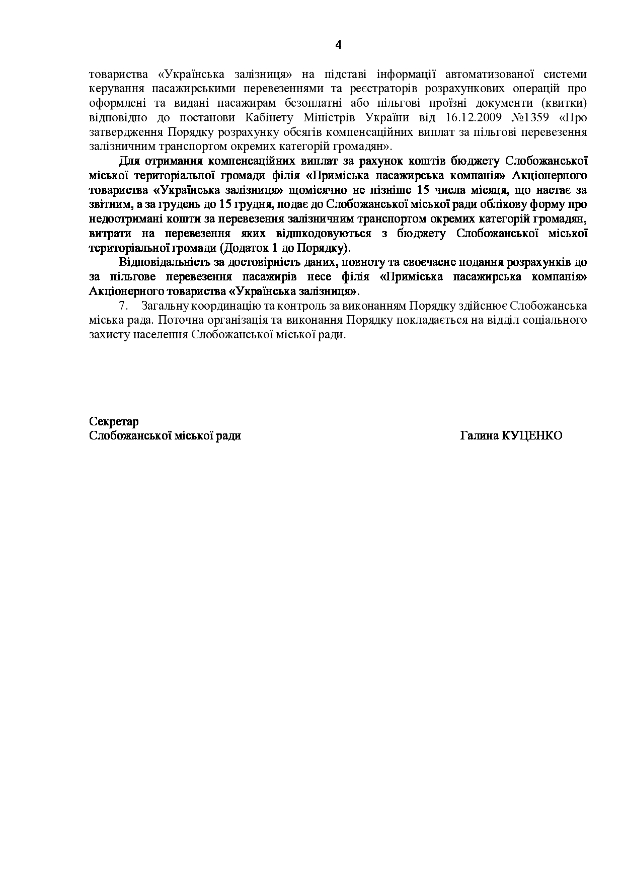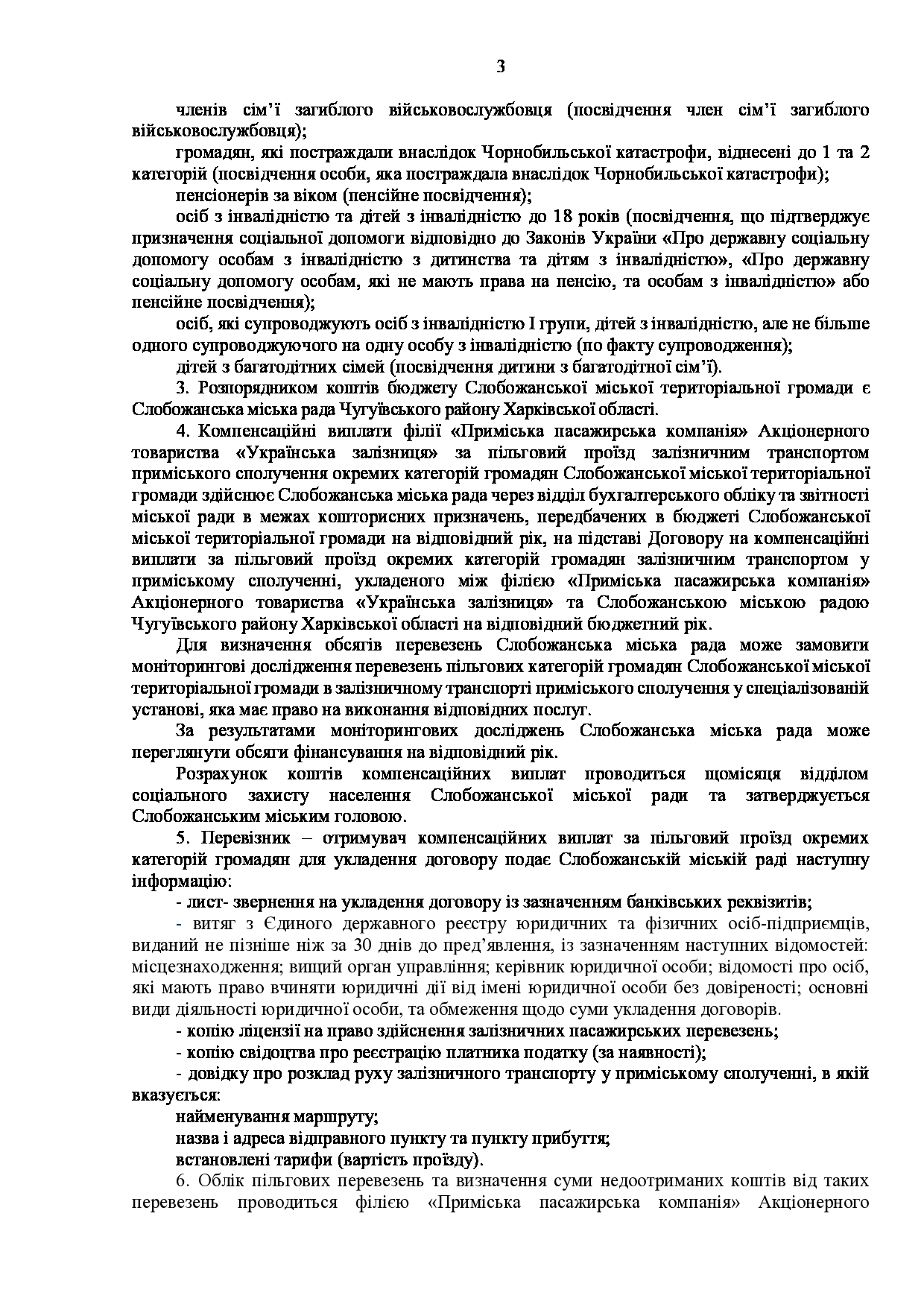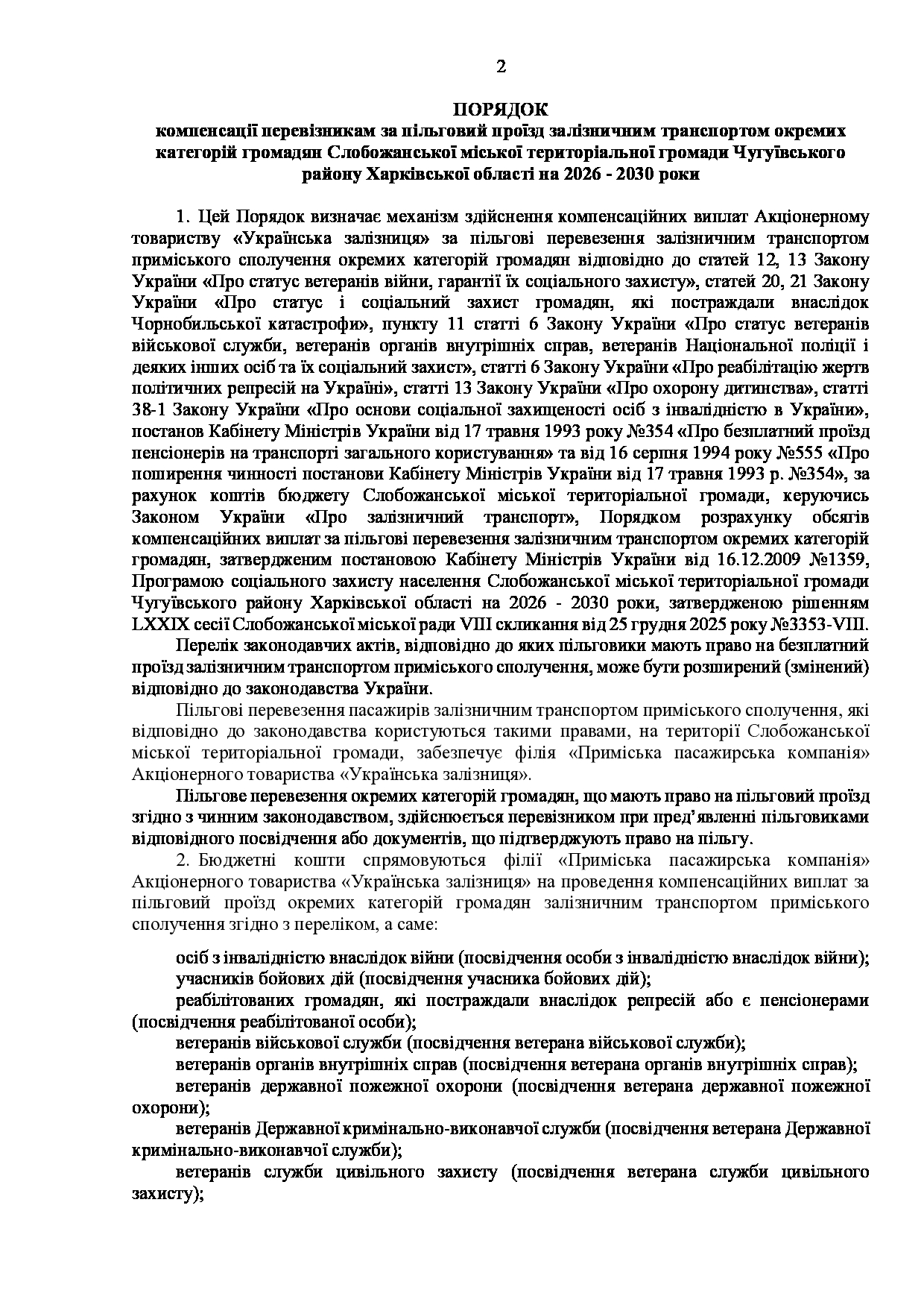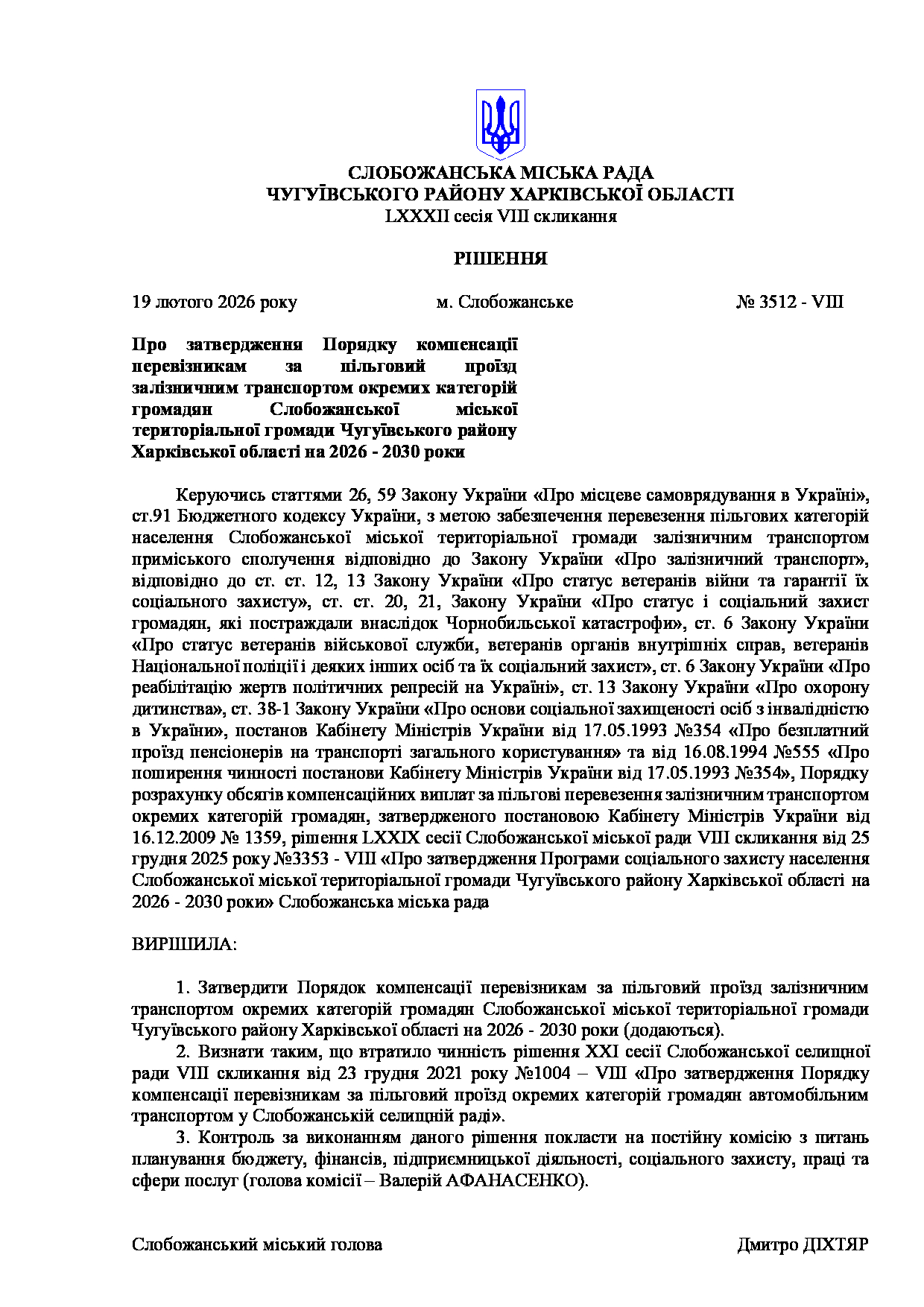 Текст рішення сесії №3512 Про затвердження Порядку компенсації перевізникам за пільговий проїзд залізничним транспортом окремих категорій громадян Слобожанської міської територіальної громади Чугуївського району Харківської області на 2026 - 2030 роки.