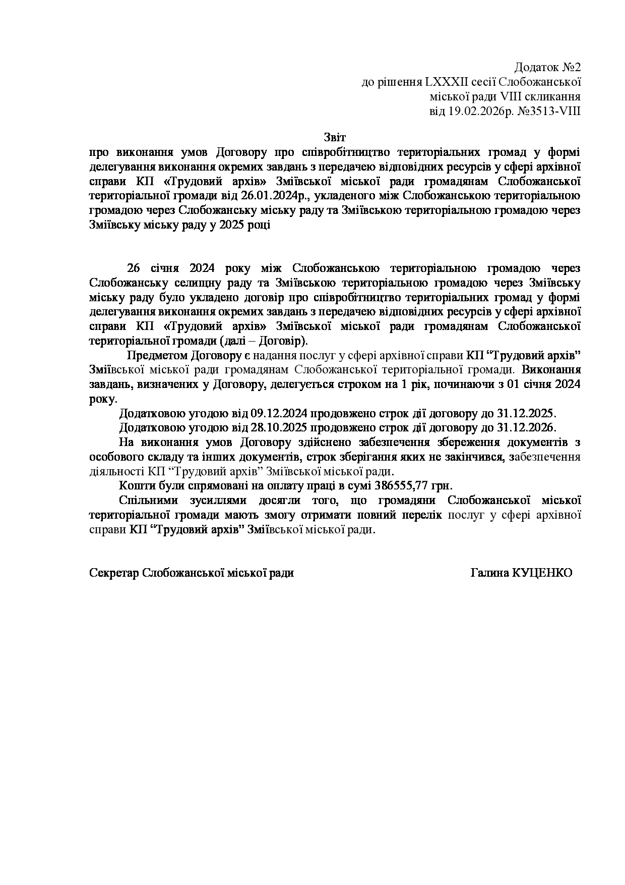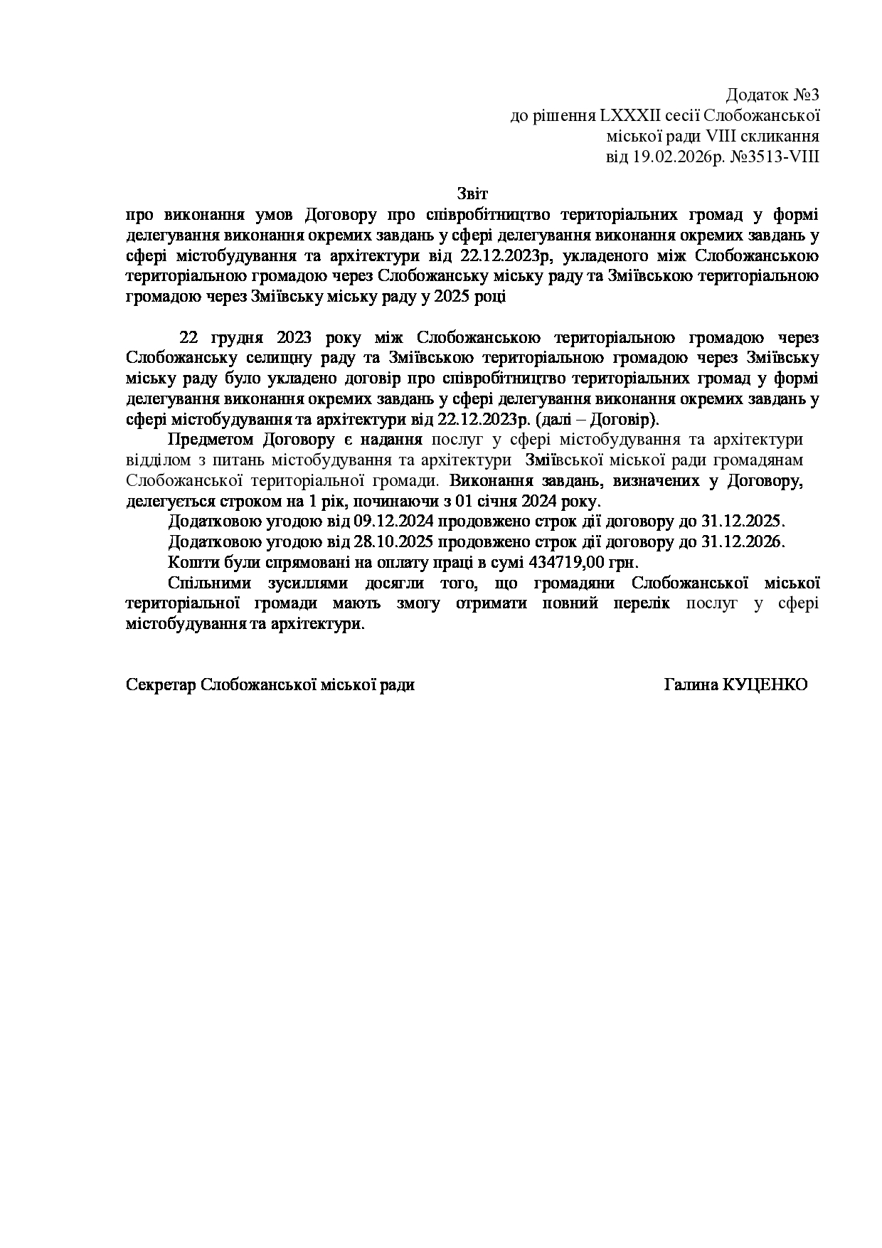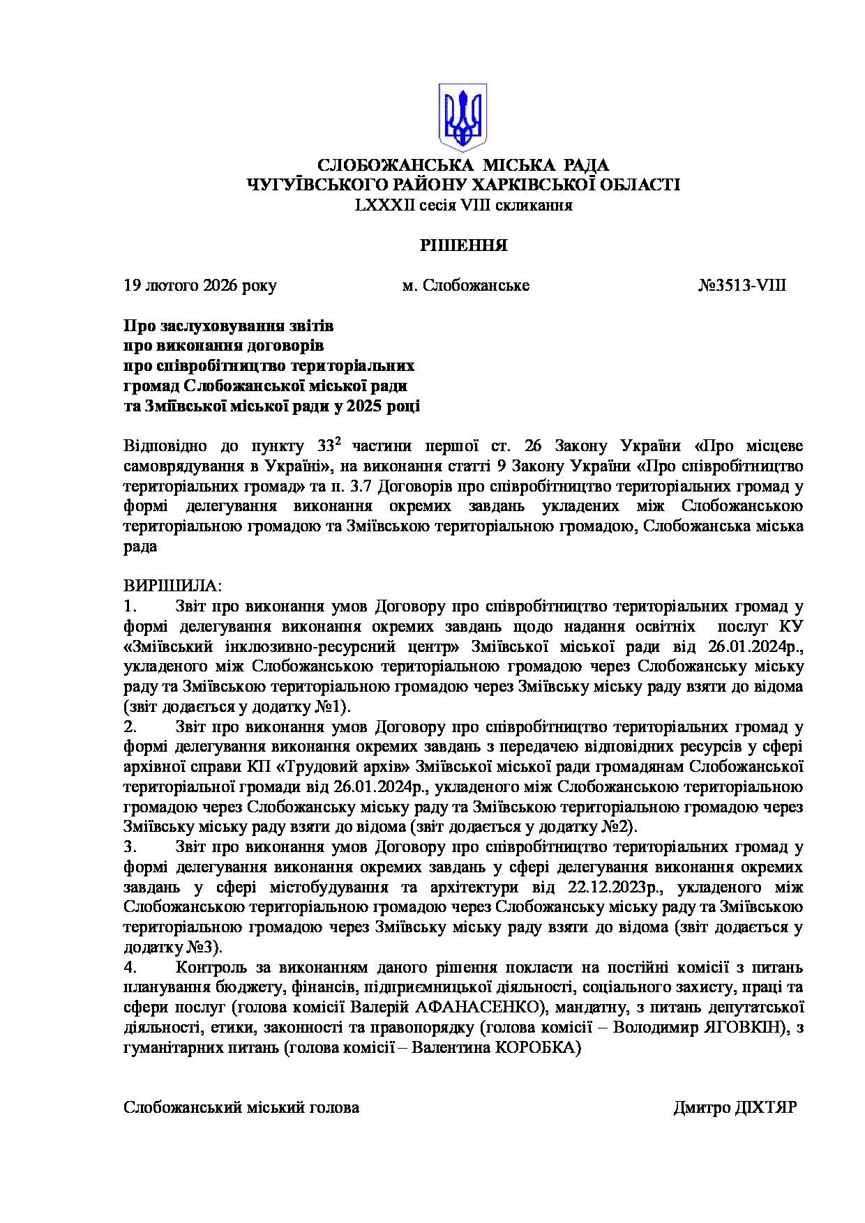 Текст рішення сесії №3513 Про заслуховування звітів про виконання договорів про співробітництво територіальних громад Слобожанської міської ради та Зміївської міської ради у 2025 році.