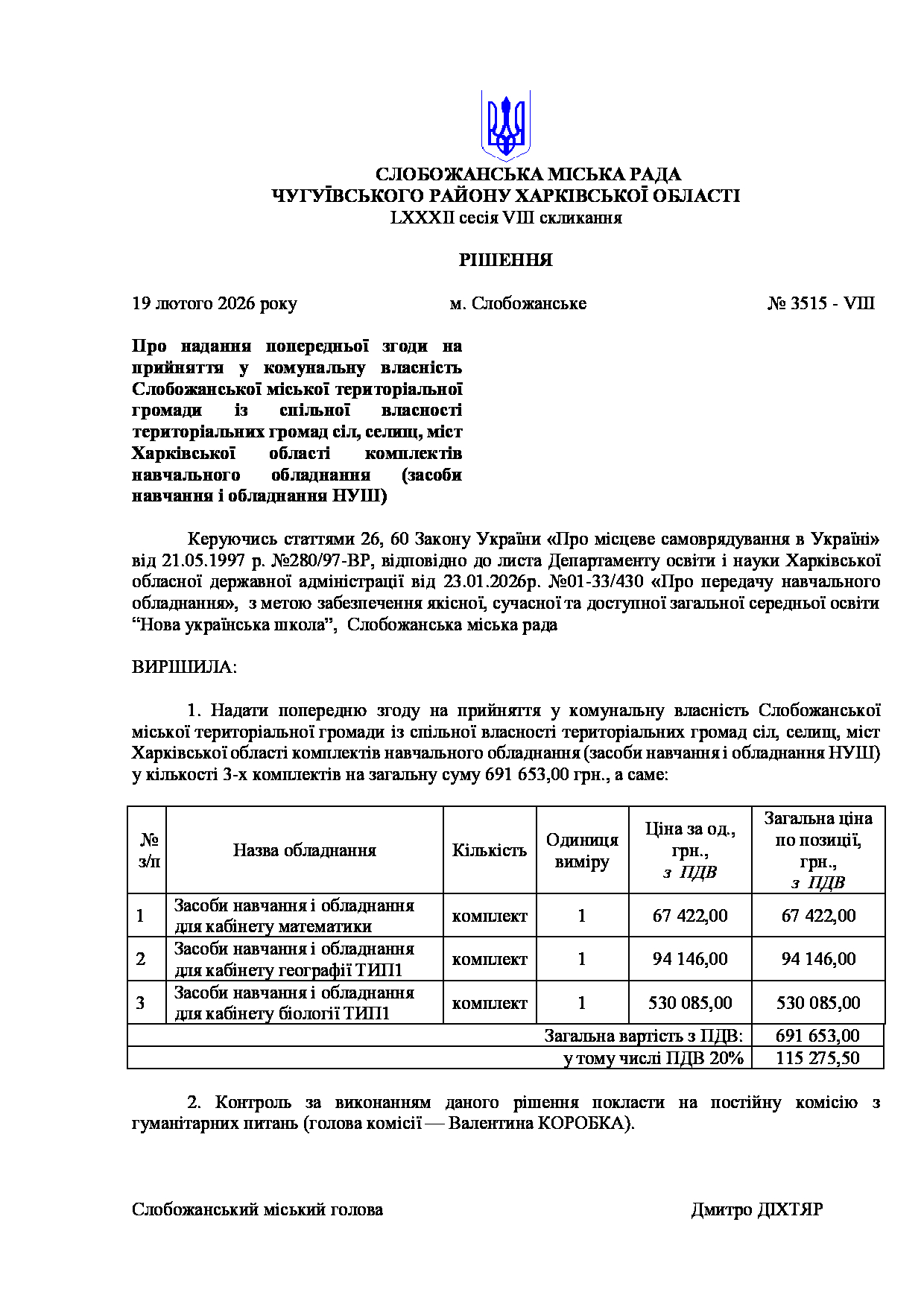 Текст рішення сесії №3515 Про надання попередньої згоди на прийняття у комунальну власність Слобожанської міської територіальної громади із спільної власності територіальних громад сіл, селищ, міст Харківської області комплектів навчального обладнання (засоби навчання і обладнання НУШ).