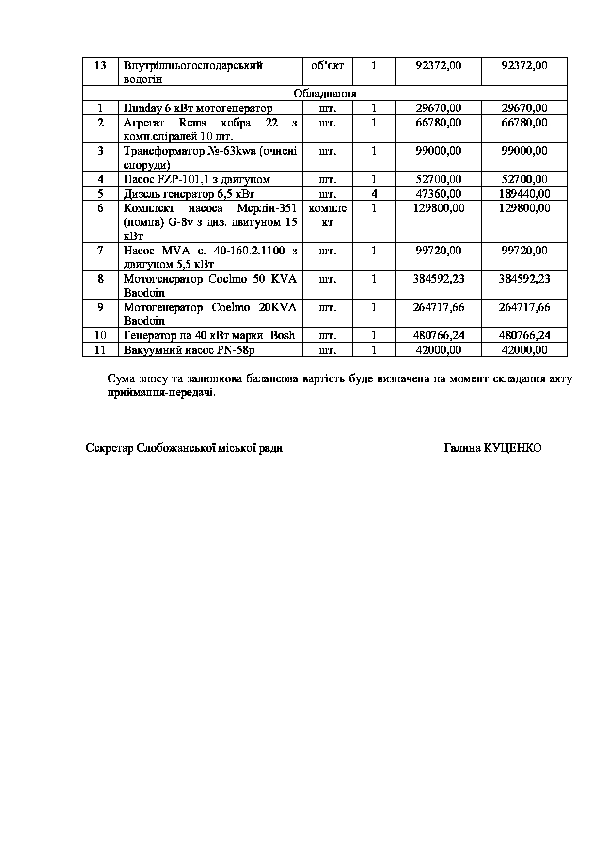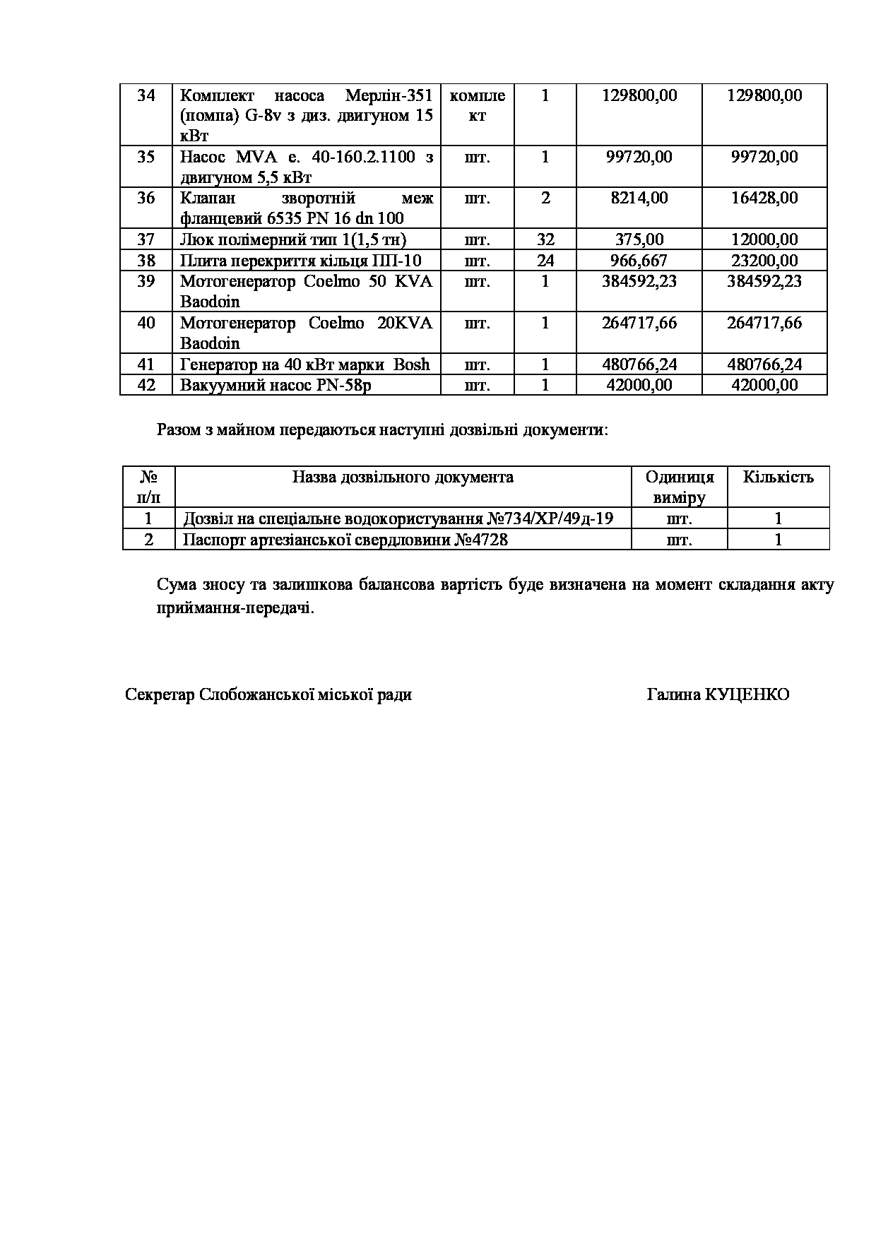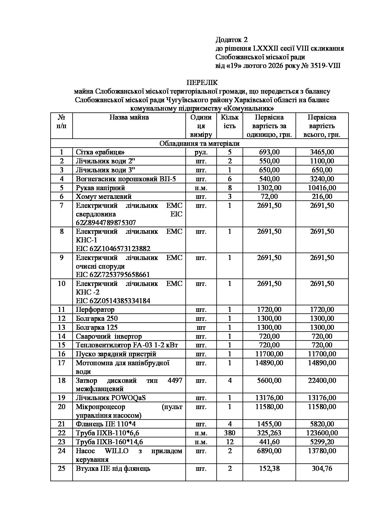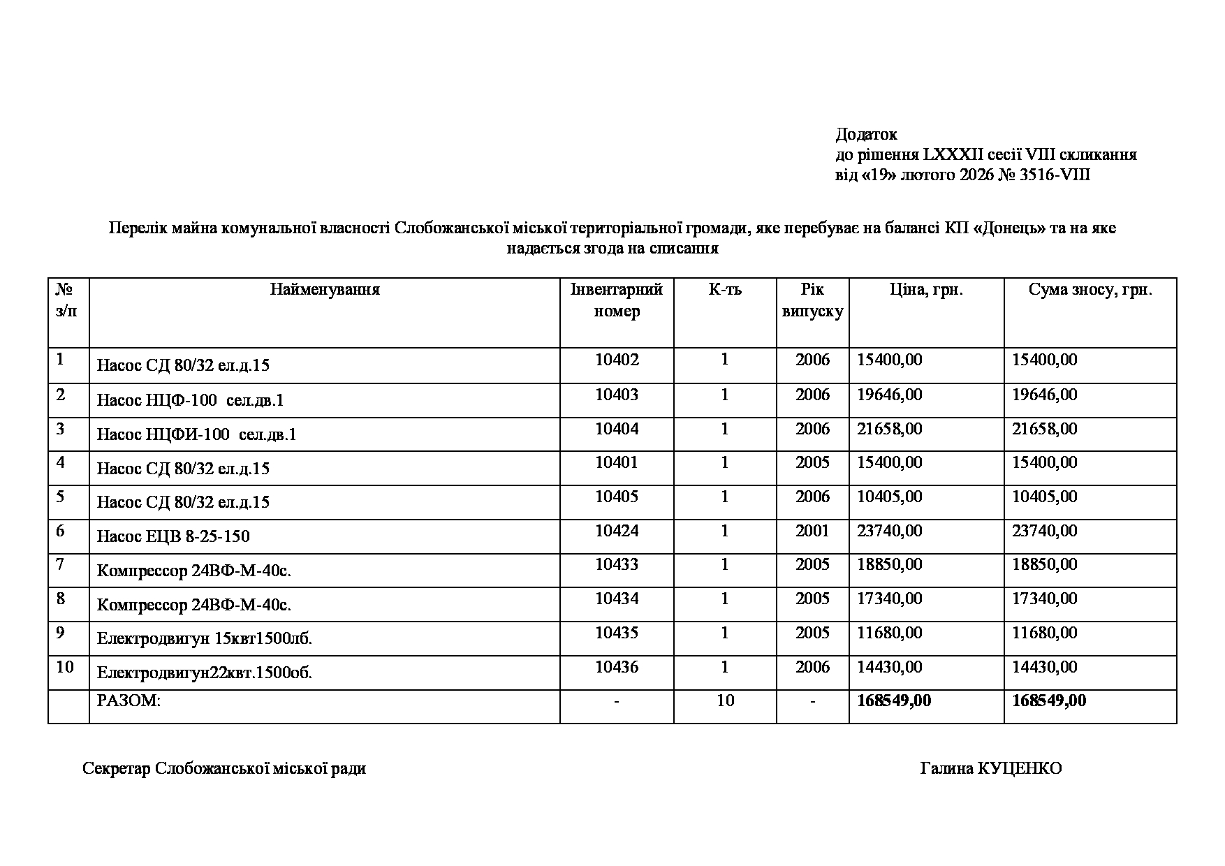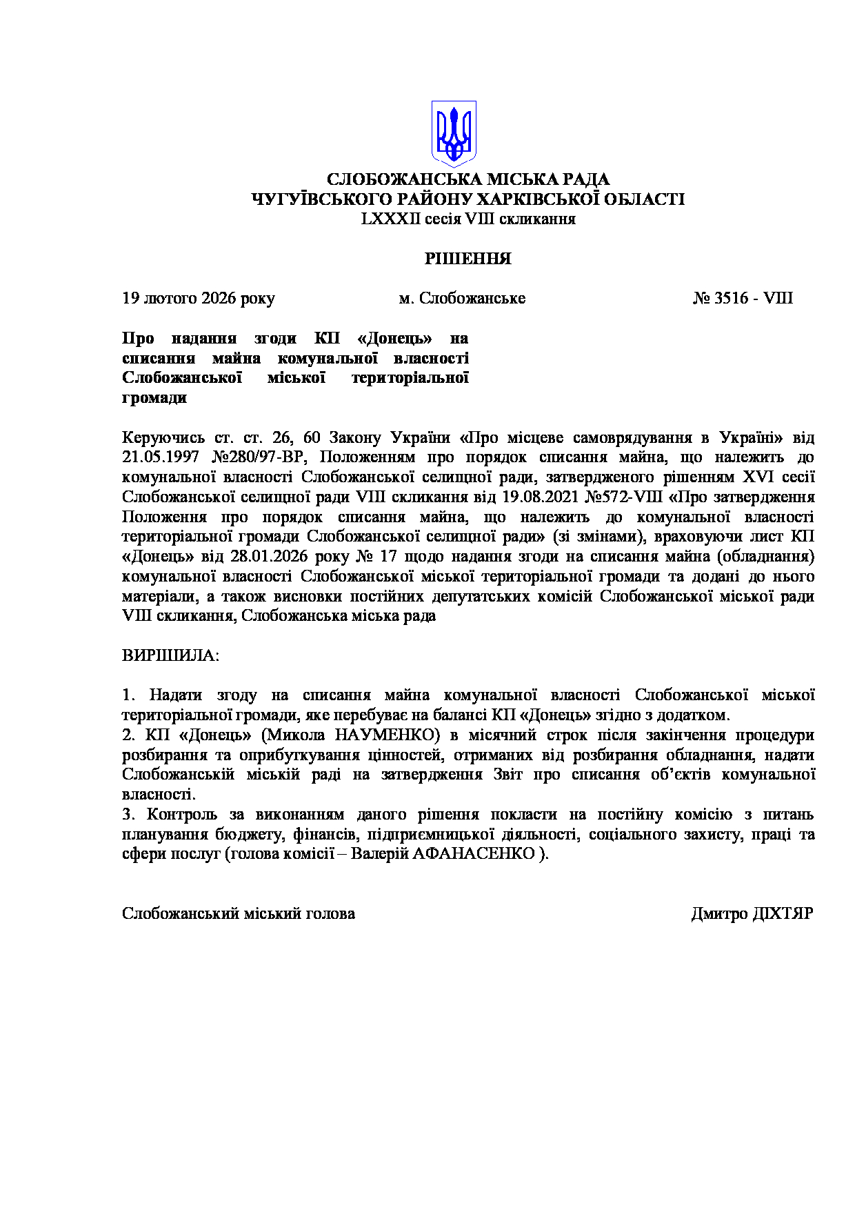 Текст рішення сесії №3516 Про надання згоди КП «Донець» на списання майна комунальної власності Слобожанської міської територіальної громади.