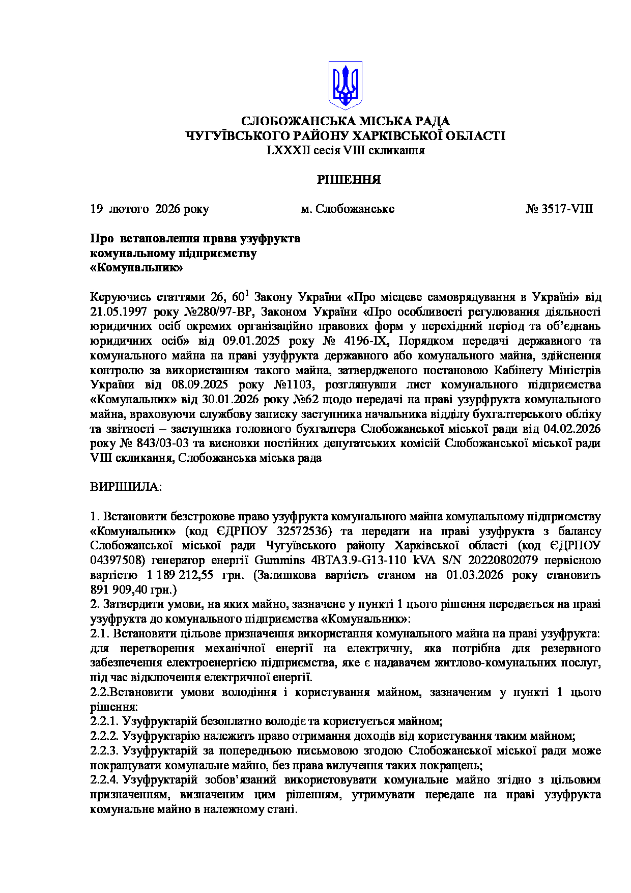 Текст рішення сесії №3517 Про встановлення права узуфрукта комунальному підприємству «Комунальник».
