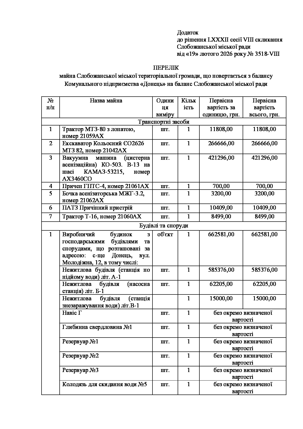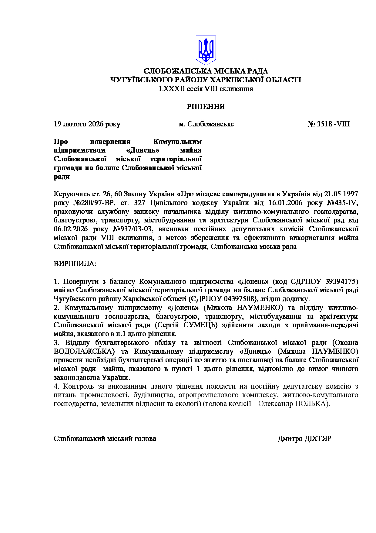 Текст рішення сесії №3518 Про повернення Комунальним підприємством «Донець» майна Слобожанської міської територіальної громади на баланс Слобожанської міської ради.