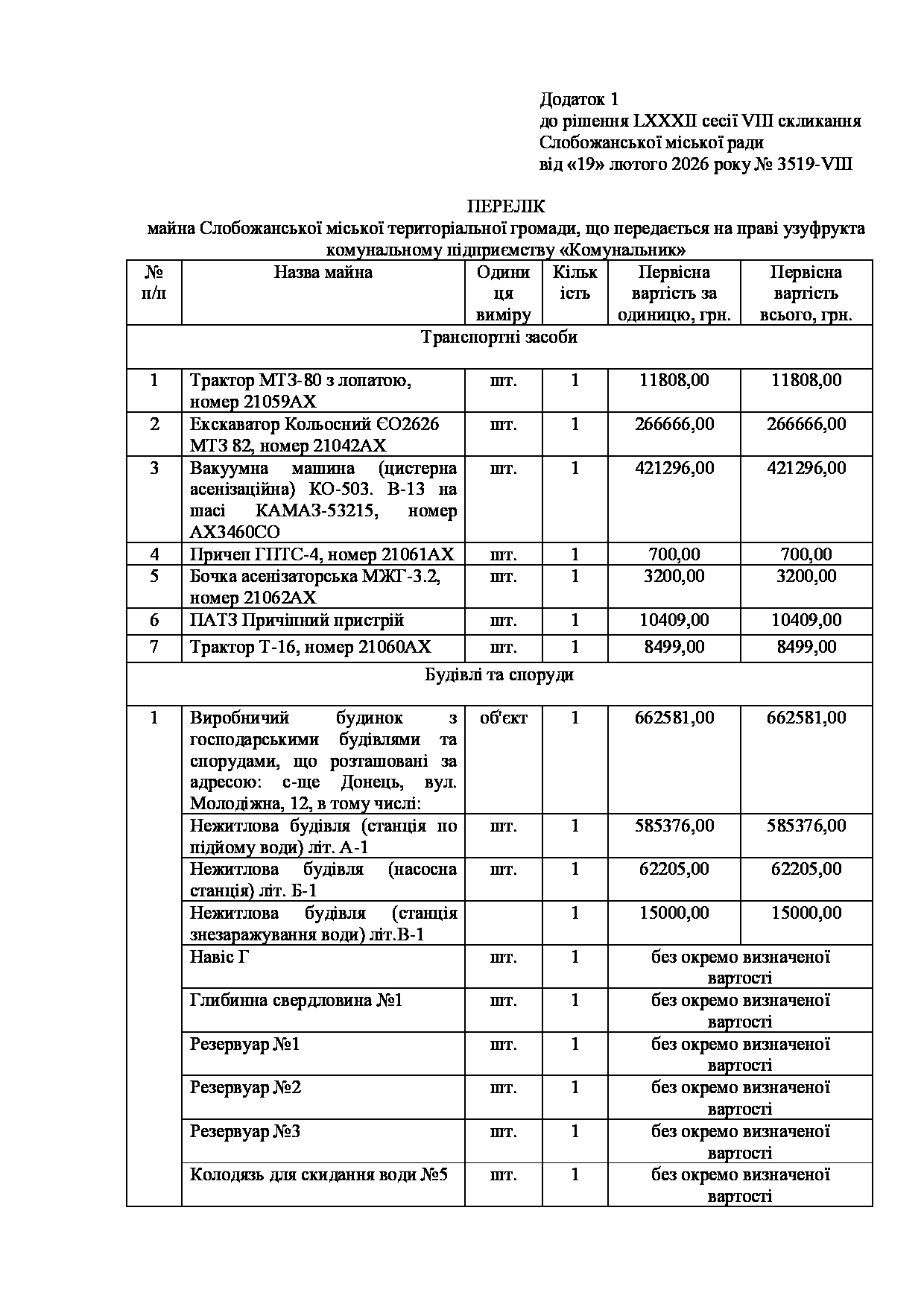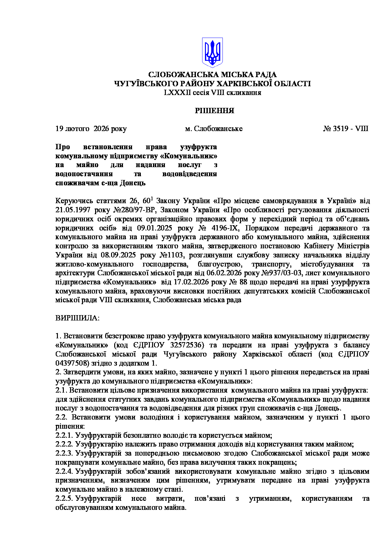 Текст рішення сесії №3519 Про встановлення права узуфрукта комунальному підприємству «Комунальник» на майно для надання послуг з водопостачання та водовідведення споживачам с-ща Донець.