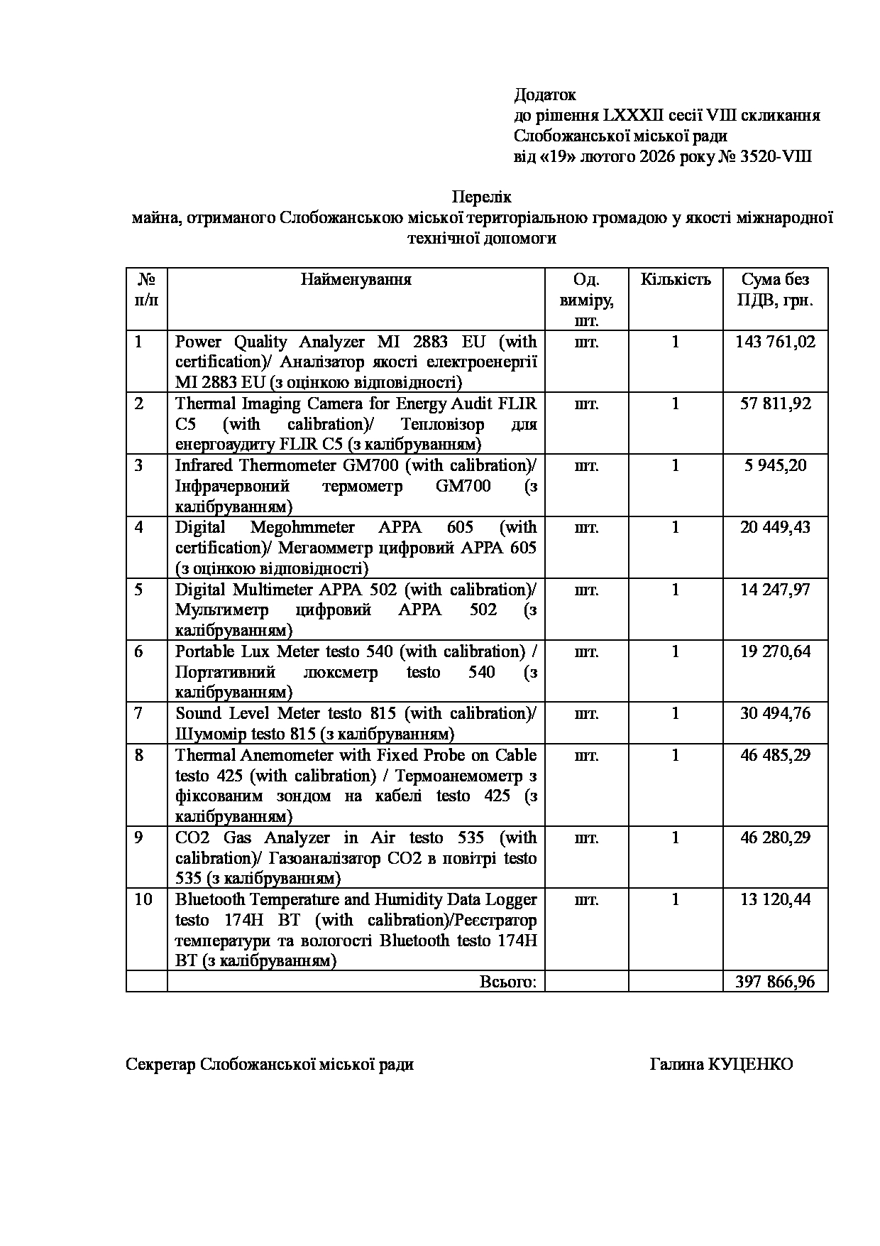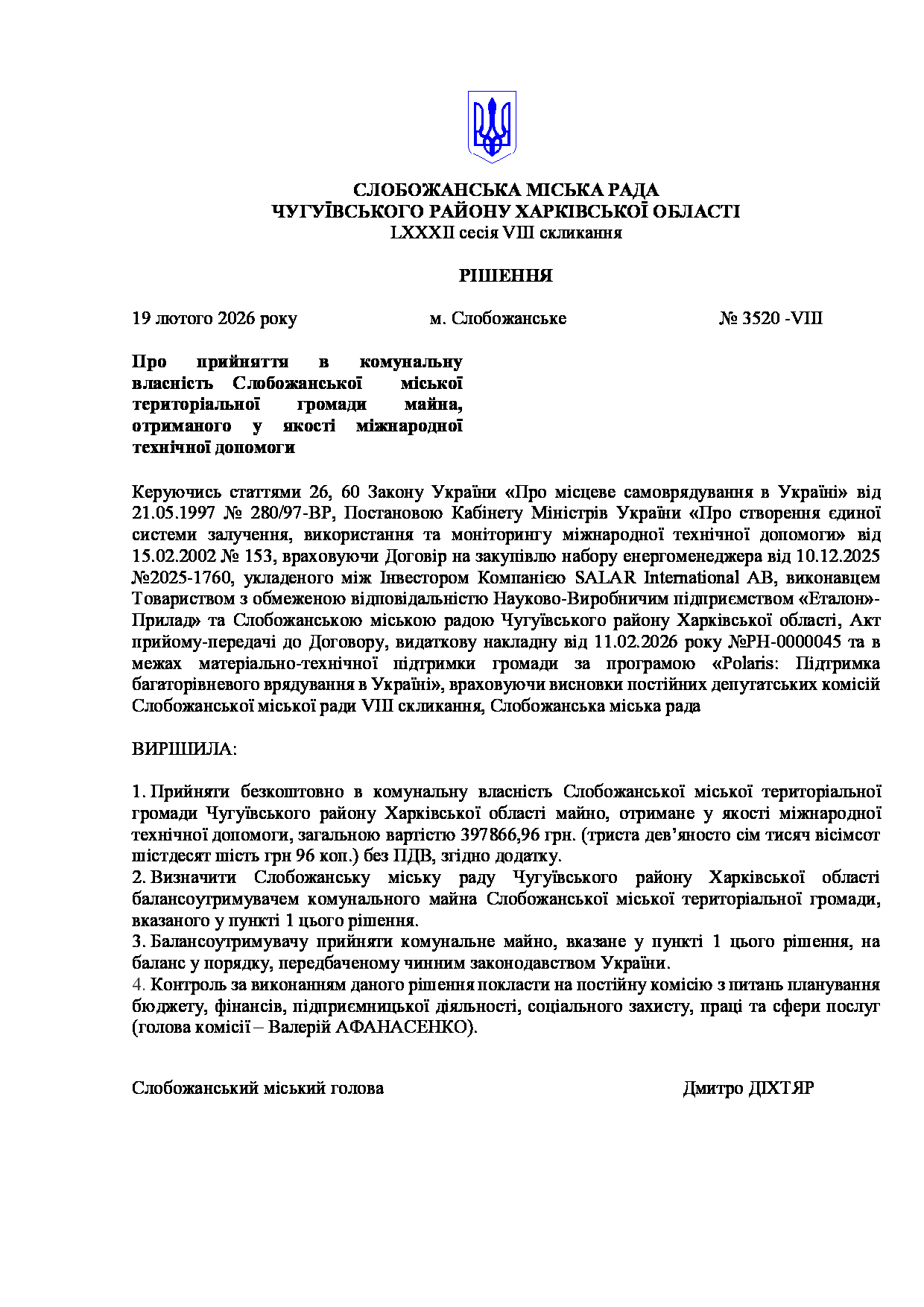 Текст рішення сесії №3520 Про прийняття в комунальну власність Слобожанської міської територіальної громади майна, отриманого у якості міжнародної технічної допомоги.