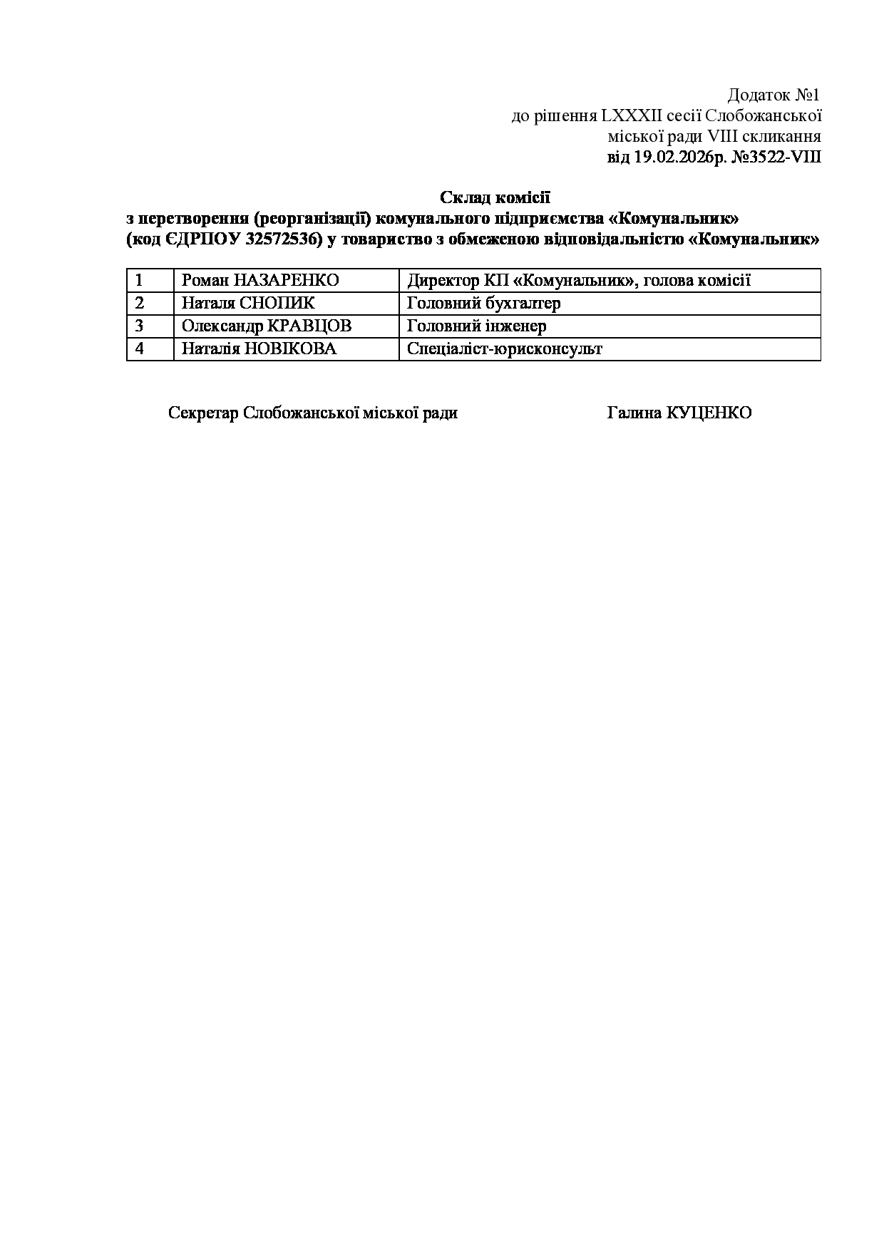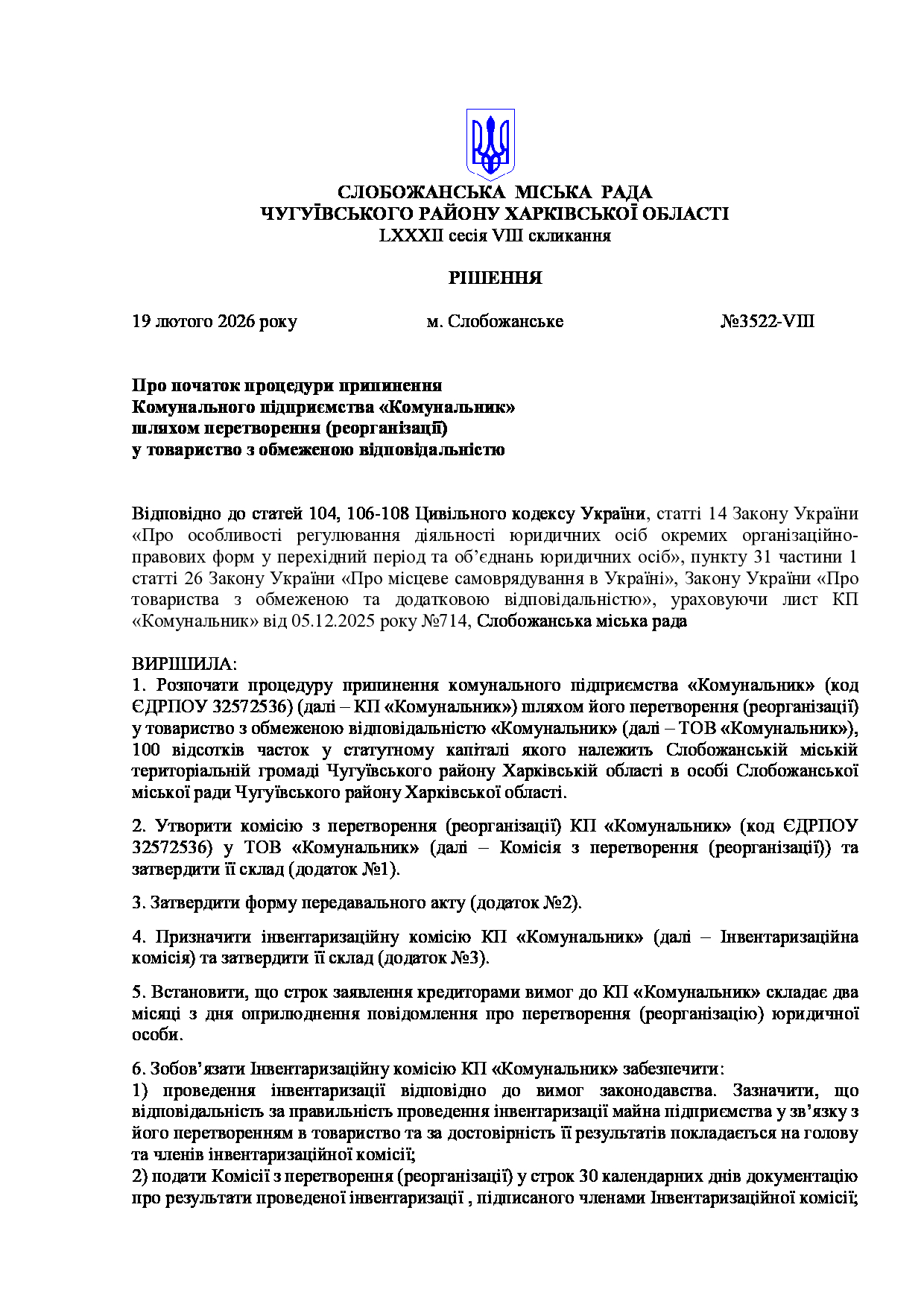 Текст рішення сесії №3522 Про початок процедури припинення Комунального підприємства «Комунальник» шляхом перетворення (реорганізації) у товариство з обмеженою відповідальністю.
