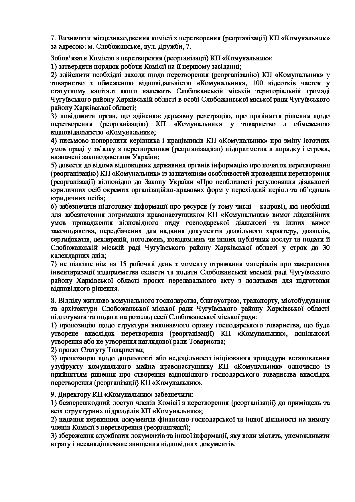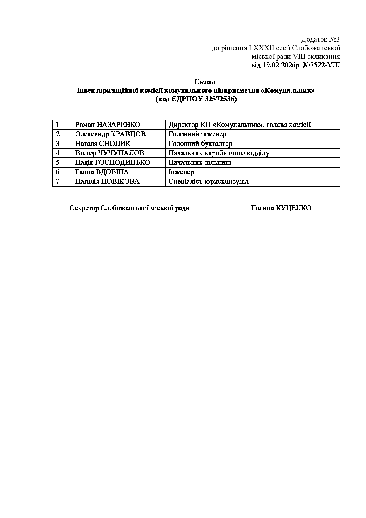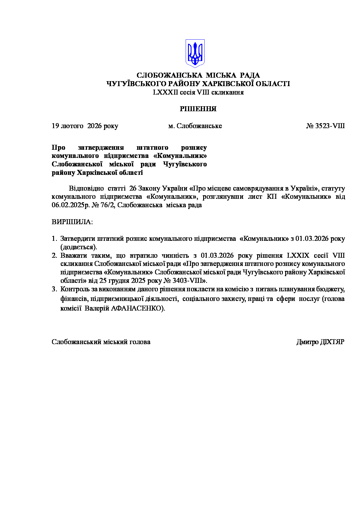 Текст рішення сесії №3523 Про затвердження штатного розпису комунального підприємства «Комунальник» Слобожанської міської ради Чугуївського району Харківської області.