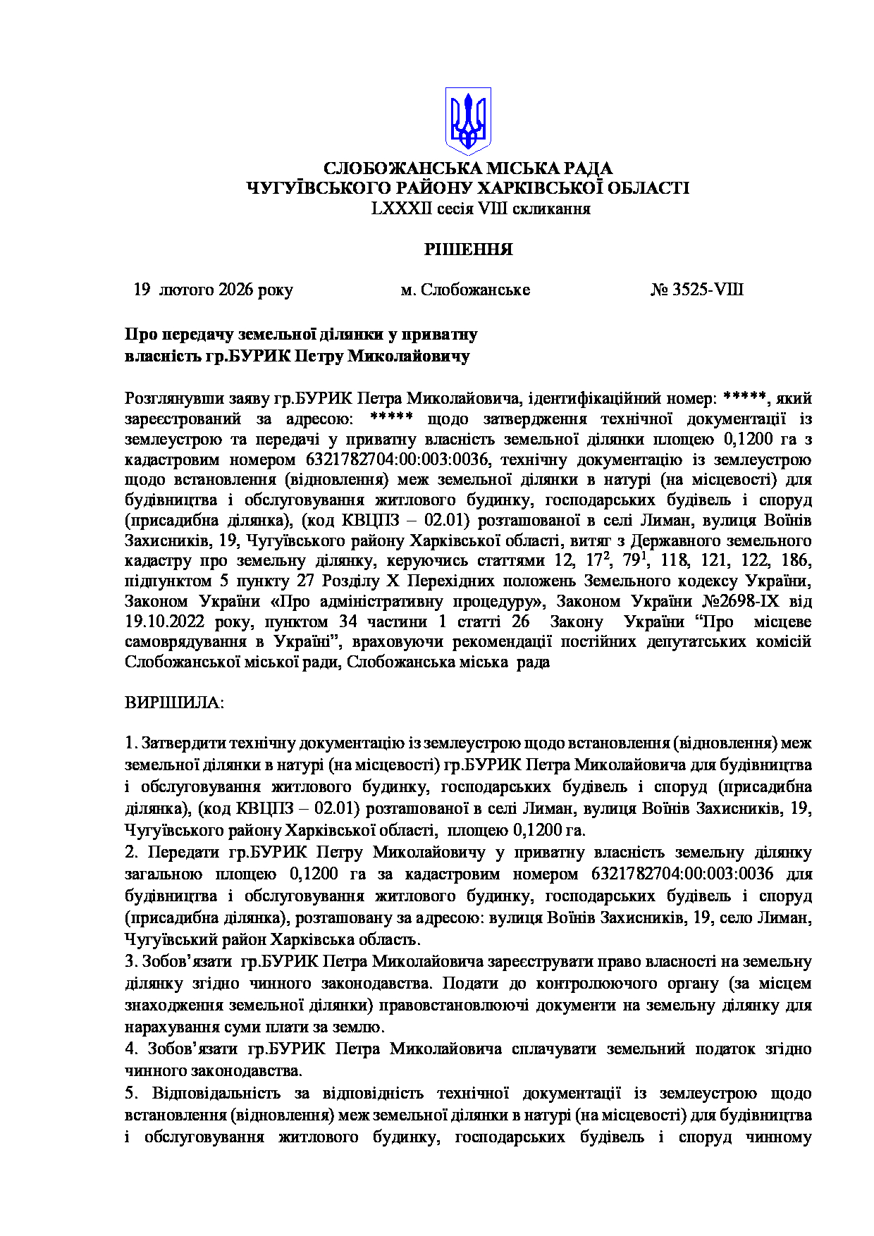 Текст рішення сесії №3525 Про передачу земельної ділянки у приватну власність гр. БУРИК Петру Миколайовичу.