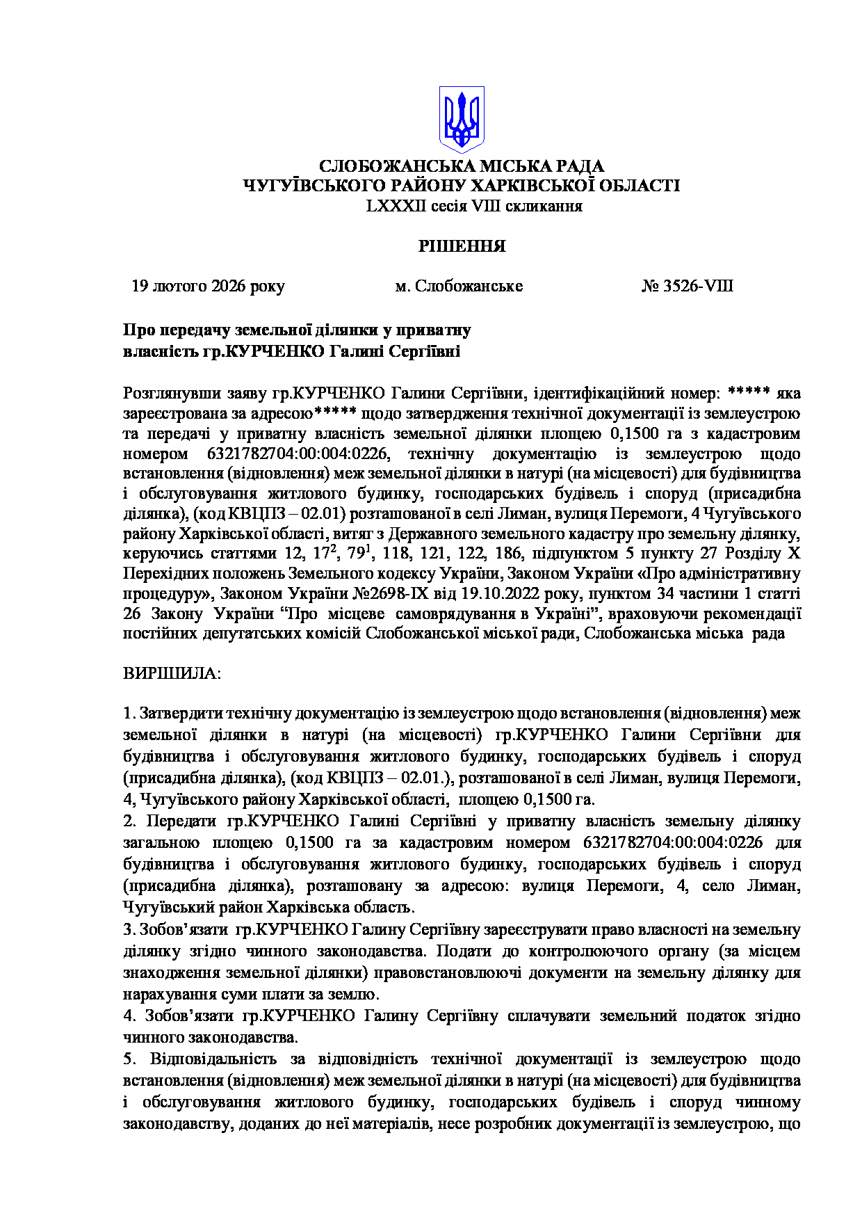 Текст рішення сесії №3526 Про передачу земельної ділянки у приватну власність гр. КУРЧЕНКО Галині Сергіївні.