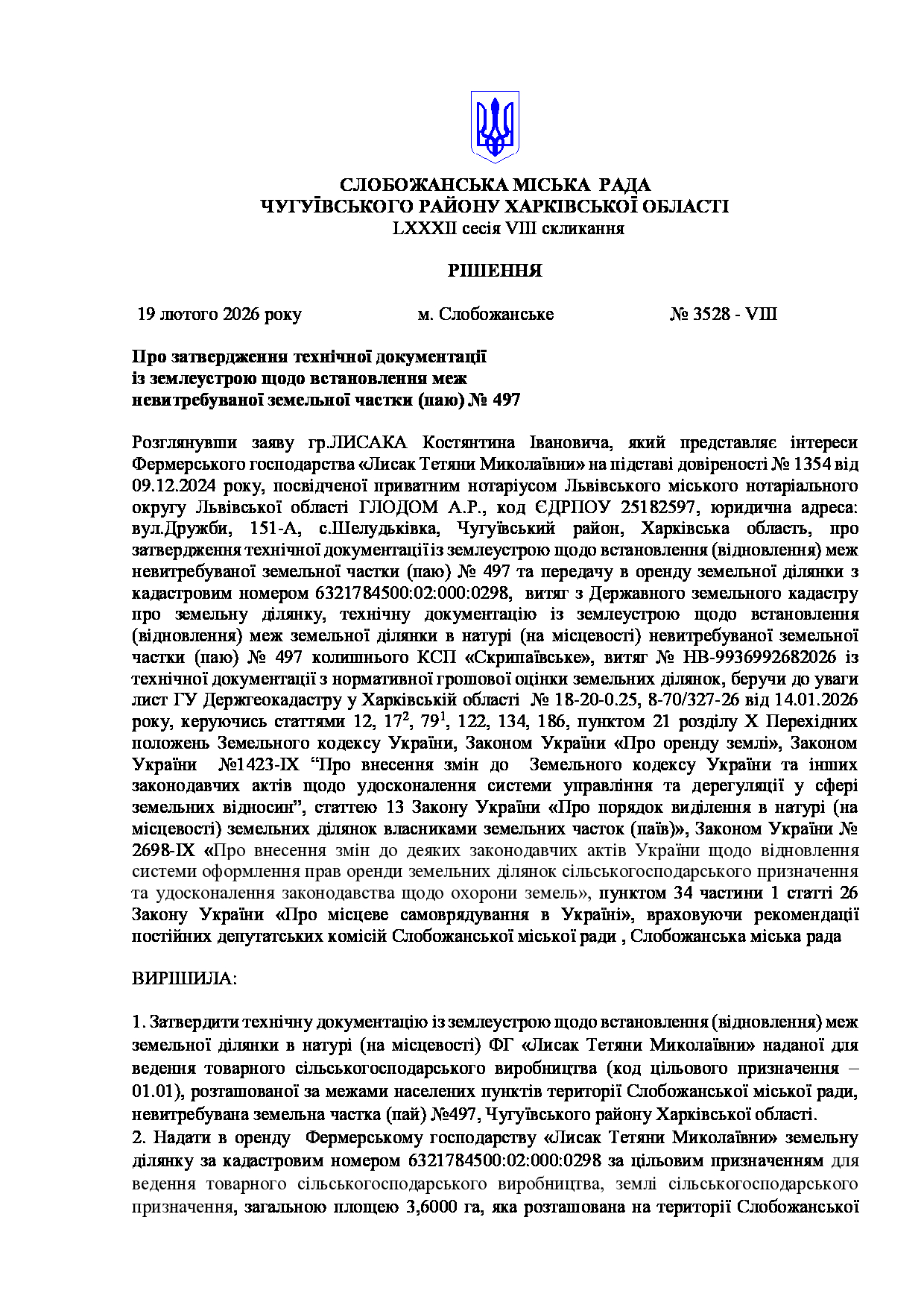 Текст рішення сесії №3528 Про затвердження технічної документації із землеустрою щодо встановлення меж невитребуваної земельної частки (паю) № 497.