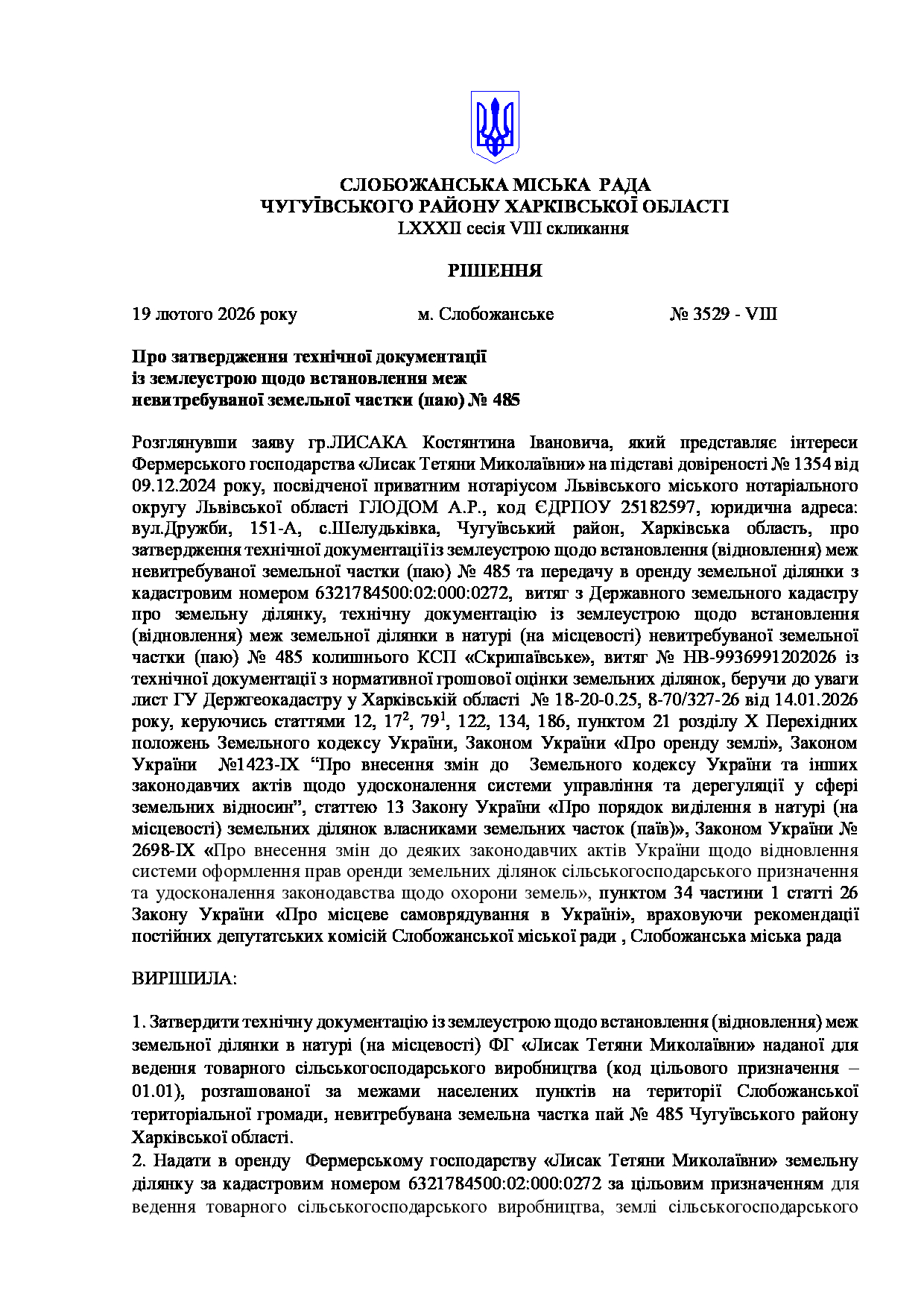 Текст рішення сесії №3529 Про затвердження технічної документації із землеустрою щодо встановлення меж невитребуваної земельної частки (паю) № 485.
