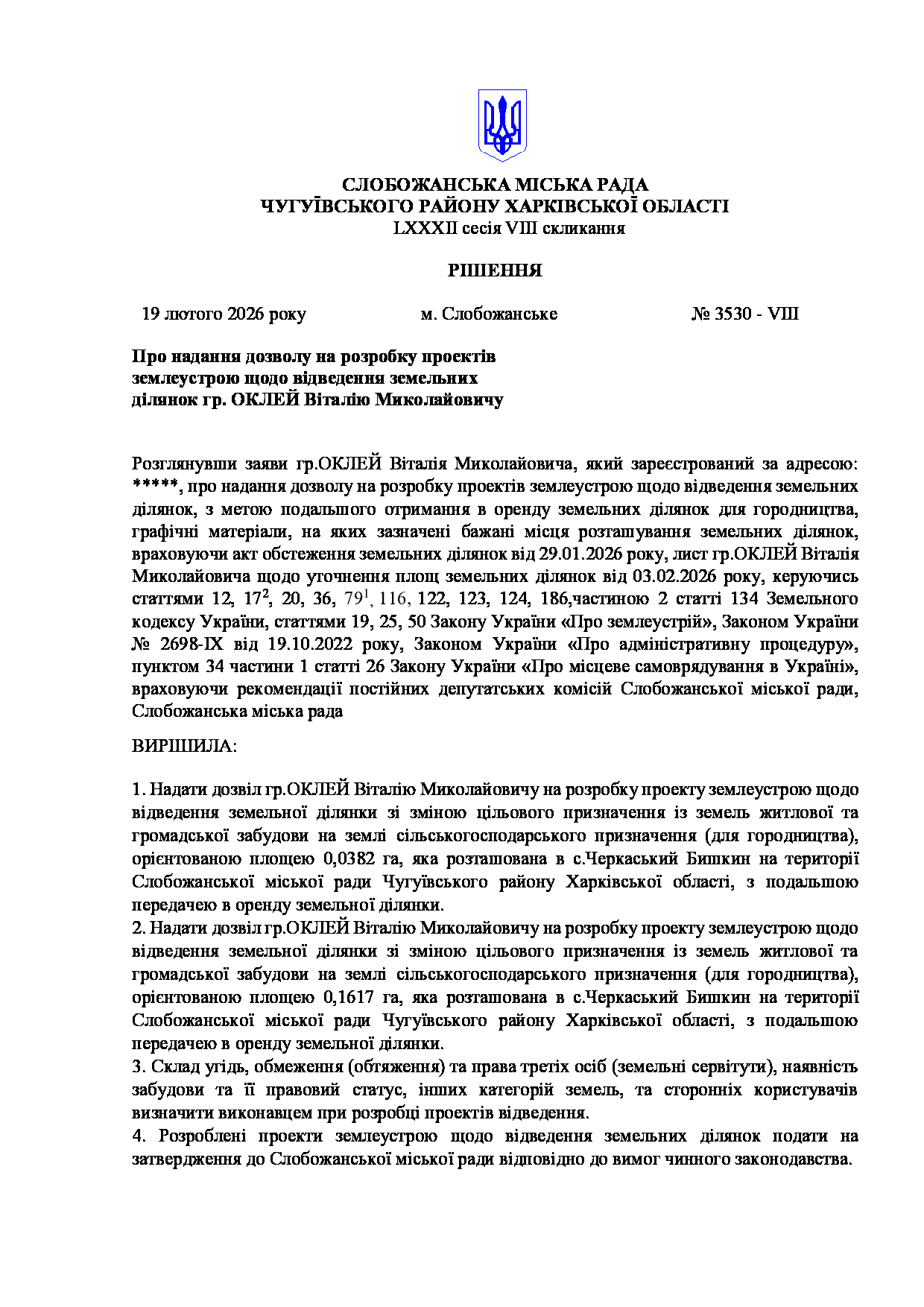 Текст рішення сесії №3530 Про надання дозволу на розробку проектів землеустрою щодо відведення земельних ділянок гр. ОКЛЕЙ Віталію Миколайовичу.