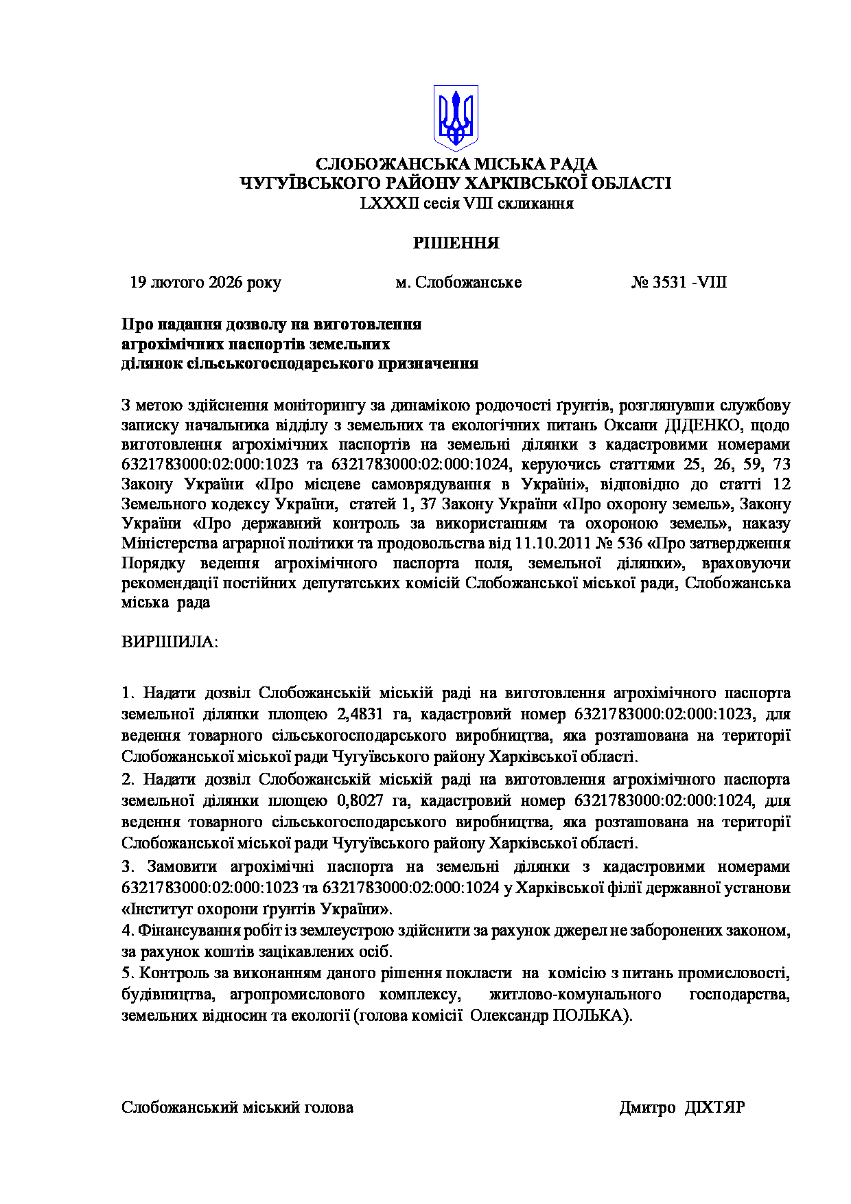 Текст рішення сесії №3531 Про надання дозволу на виготовлення агрохімічних паспортів земельних ділянок сільськогосподарського призначення.