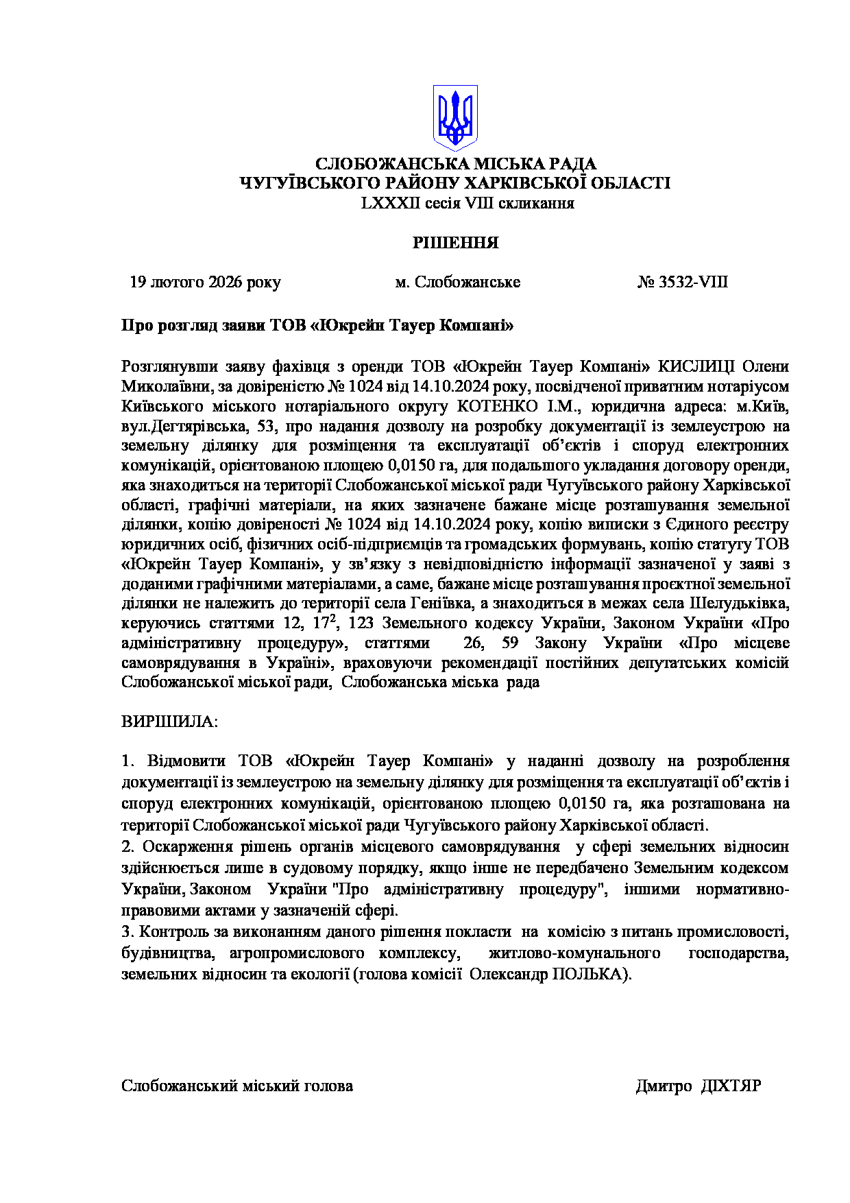 Текст рішення сесії №3532 Про розгляд заяви ТОВ «Юкрейн Тауер Компані».