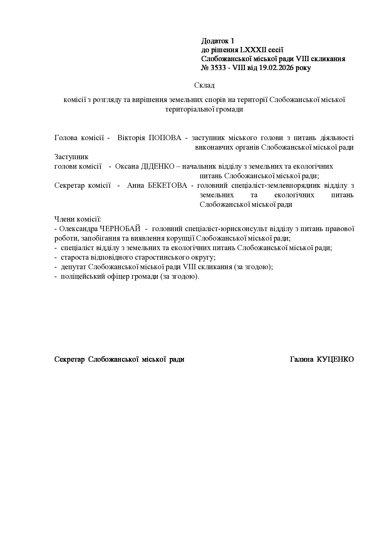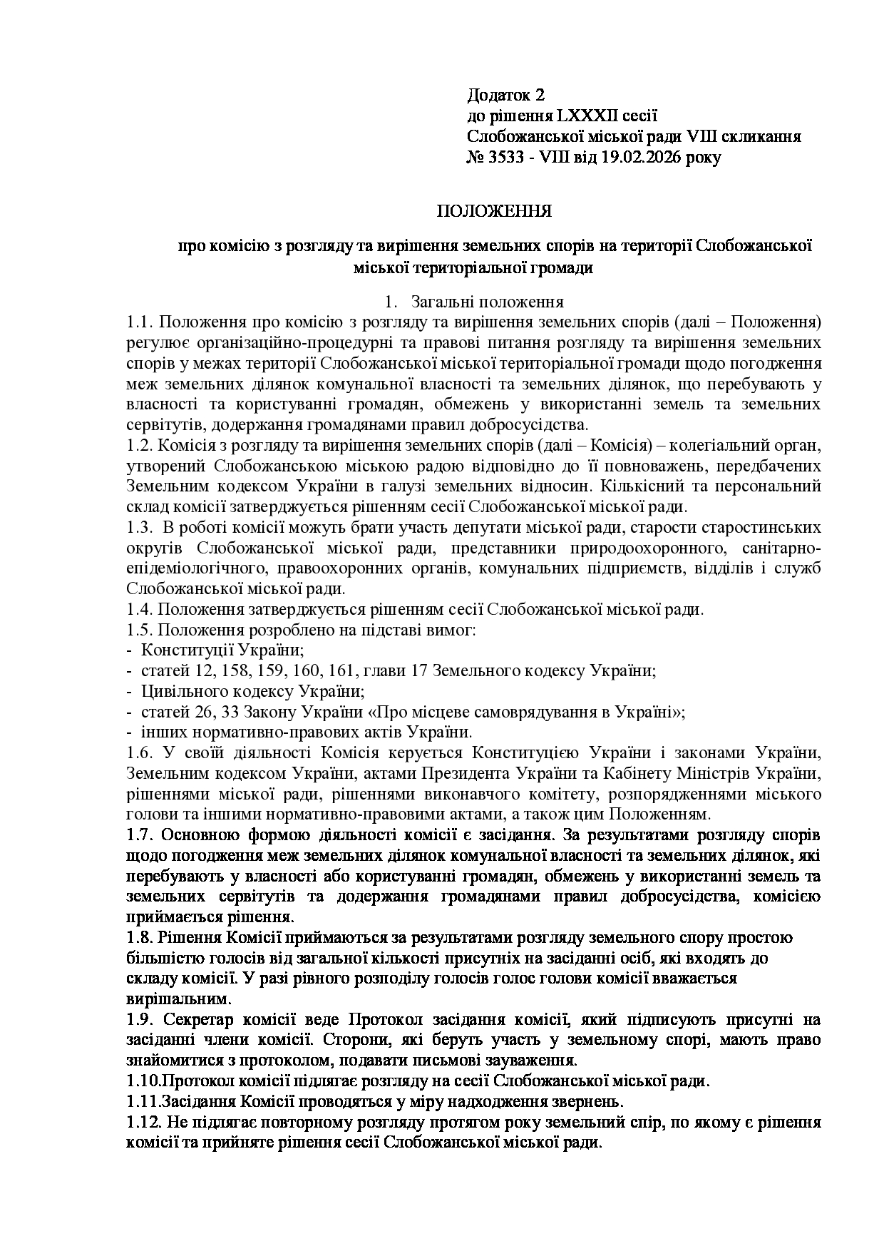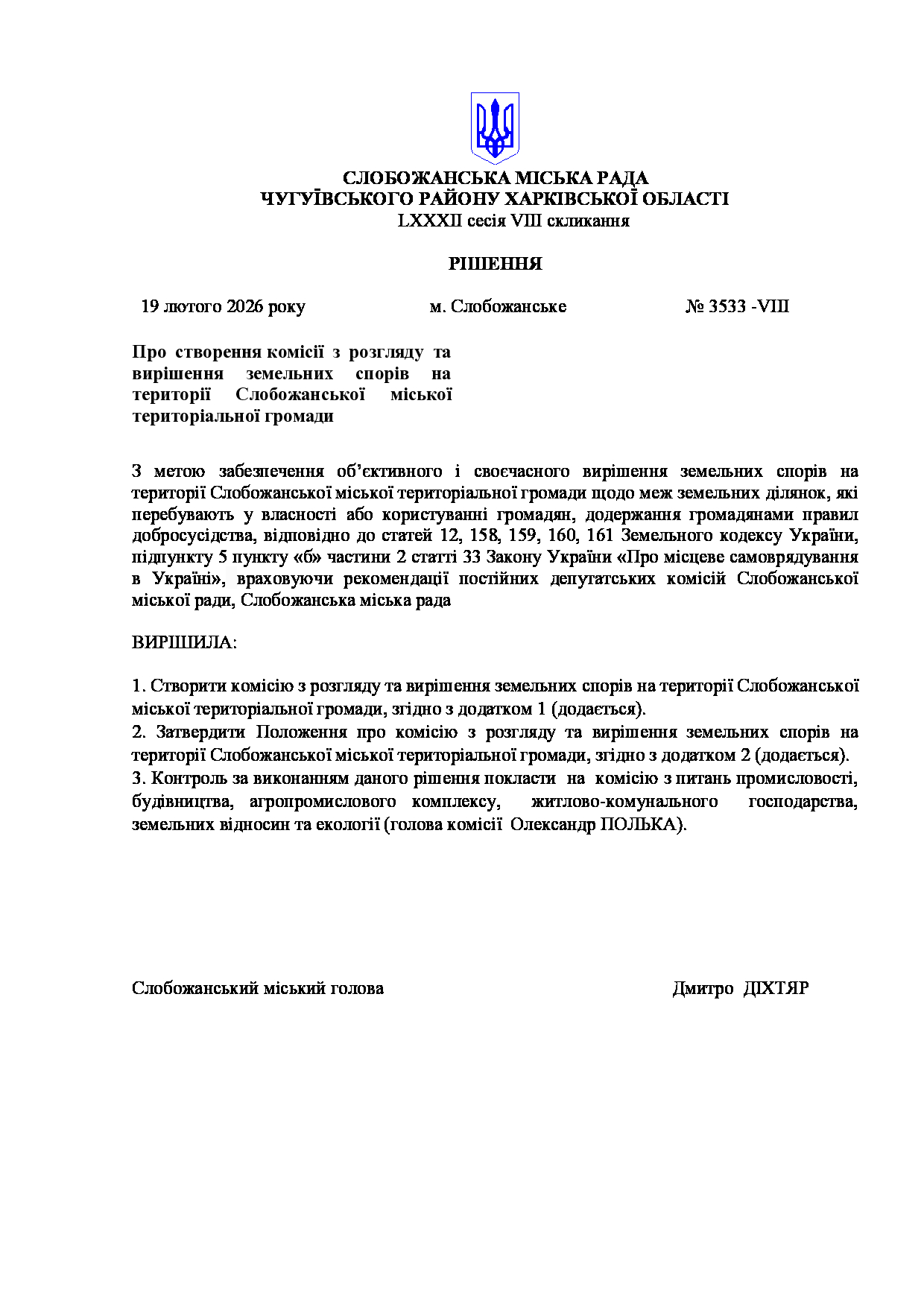 Текст рішення сесії №3533 Про створення комісії з розгляду та вирішення земельних спорів на території Слобожанської міської територіальної громади.